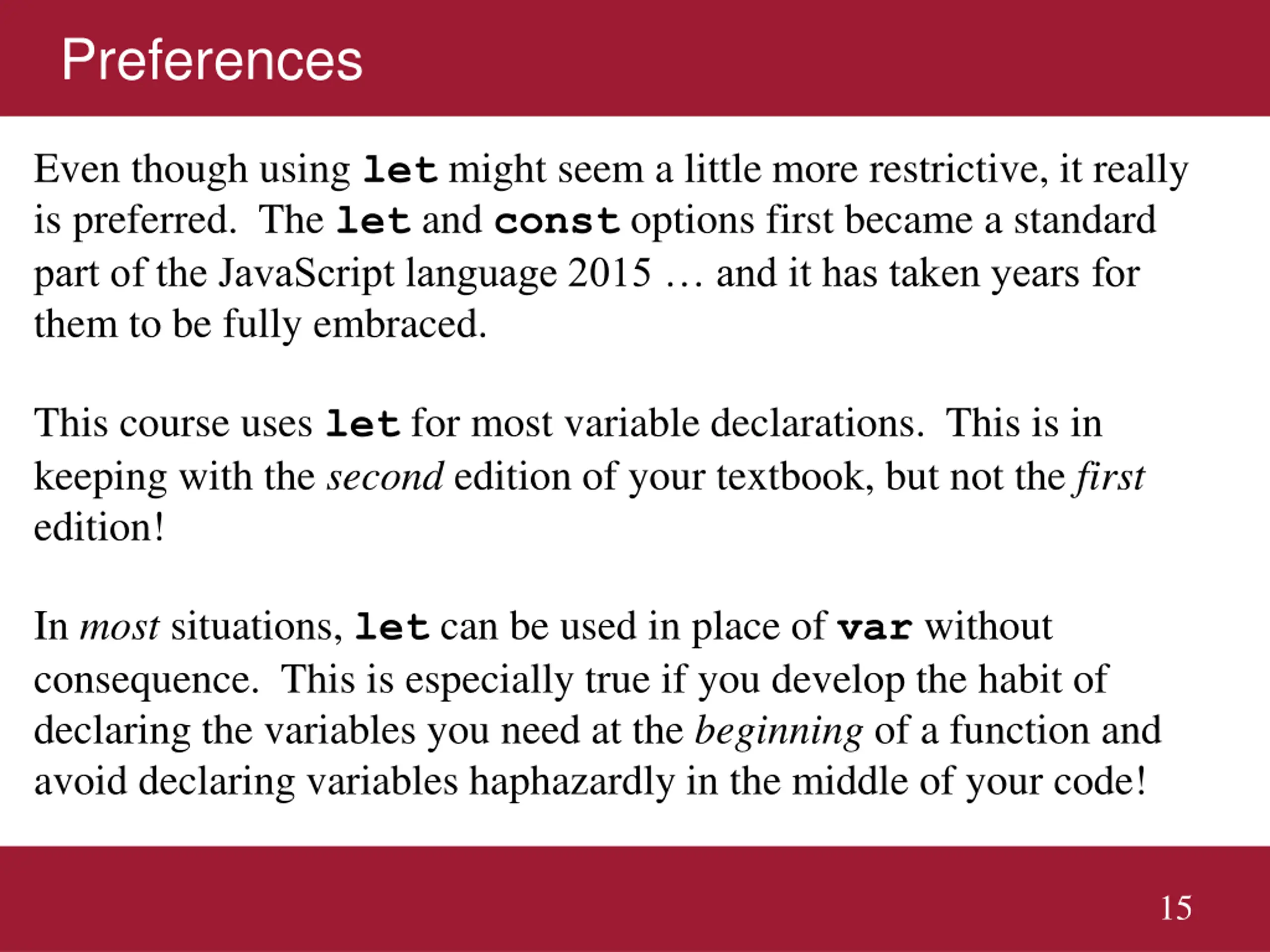 Preferences Even though using let might seem a little more restrictive, it really is preferred. The let and const options first became a standard part of the JavaScript language 2015 and it has taken years for them to be fully embraced. This course uses let for most variable declarations. This is in keeping with the second edition of your textbook, but not the first edition! In most situations, let can be used in place of var without consequence. This is especially true if you develop the habit of declaring the variables you need at the beginning of a function and avoid declaring variables haphazardly in the middle of your code! 15