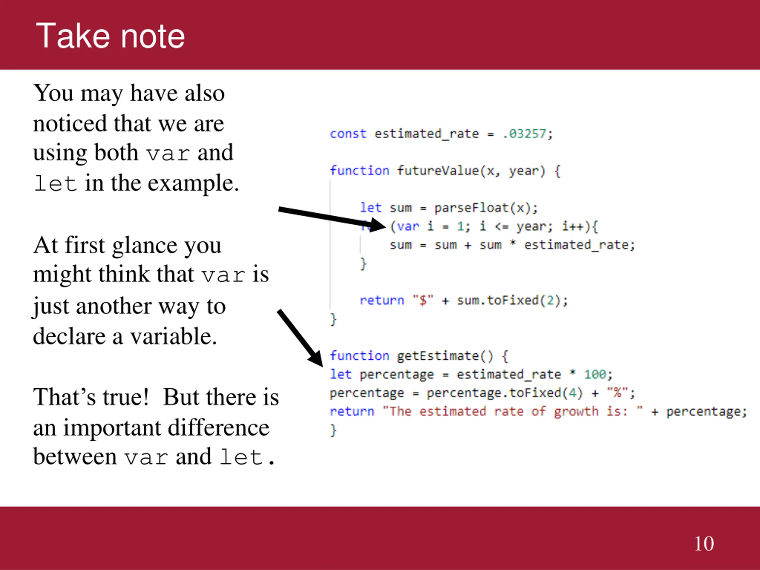 Take note You may have also noticed that we are using both var and let in the example. At first glance you might think that var is just another way to declare a variable. That s true! But there is an important difference between var and let. 10
