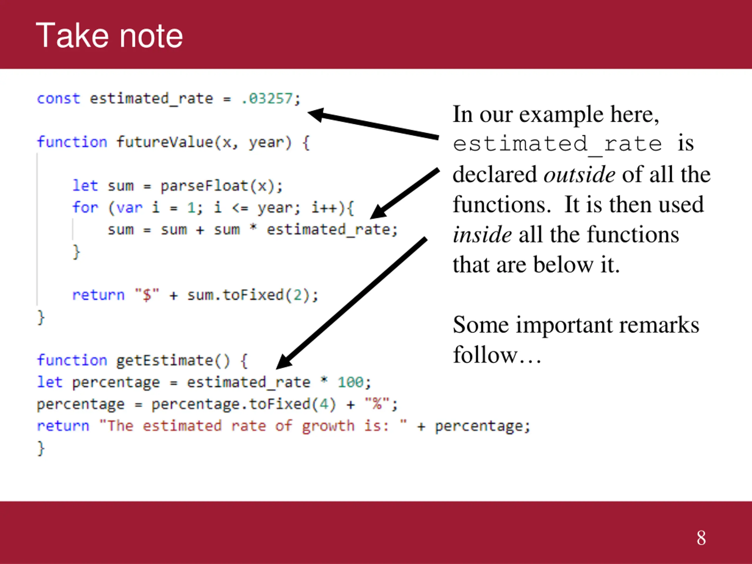 Take note In our example here, estimated_rate is declared outside of all the functions. It is then used inside all the functions that are below it. Some important remarks follow 8