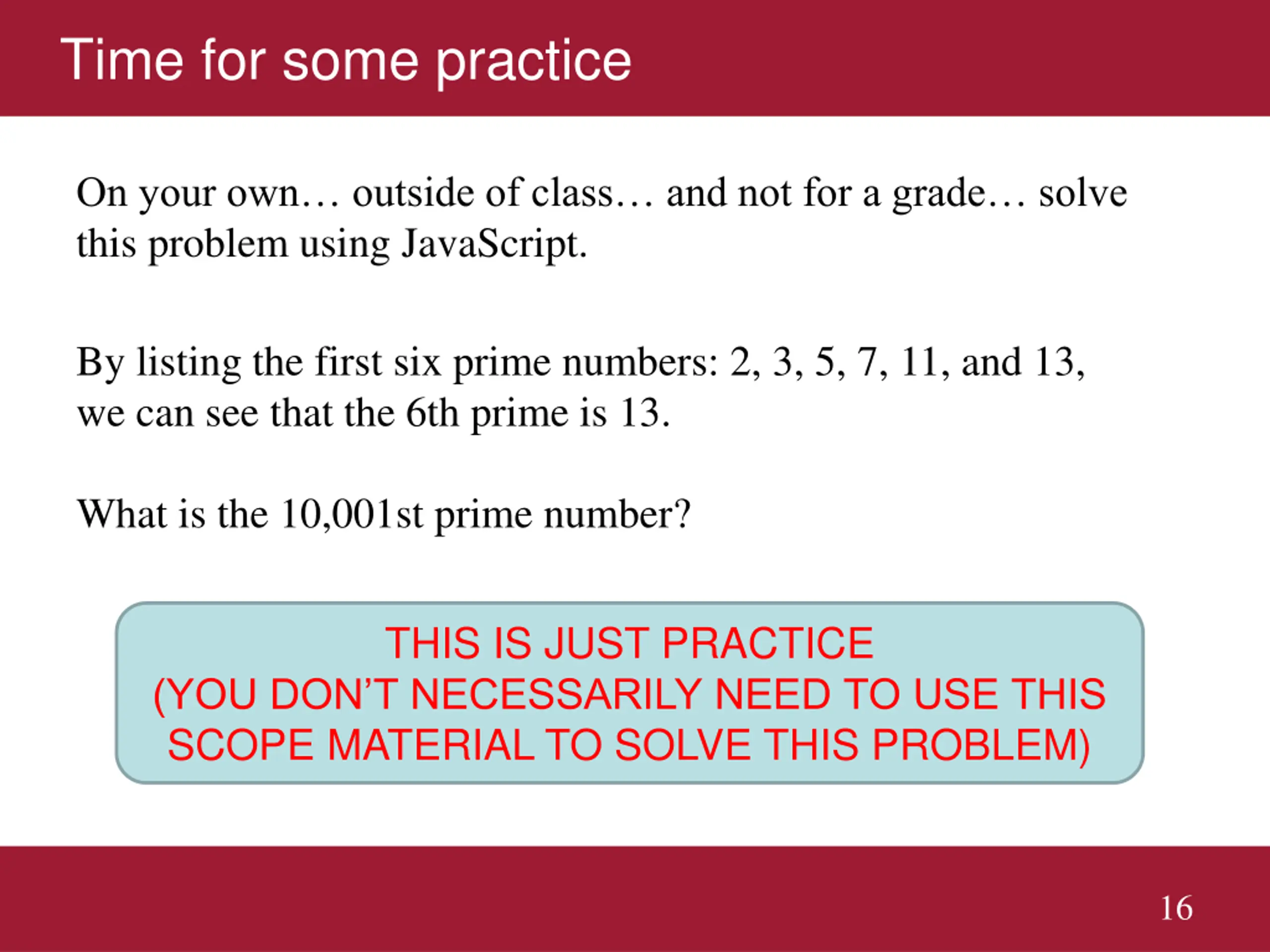 Time for some practice On your own outside of class and not for a grade solve this problem using JavaScript. By listing the first six prime numbers: 2, 3, 5, 7, 11, and 13, we can see that the 6th prime is 13. What is the 10,001st prime number? THIS IS JUST PRACTICE (YOU DON T NECESSARILY NEED TO USE THIS SCOPE MATERIAL TO SOLVE THIS PROBLEM) 16