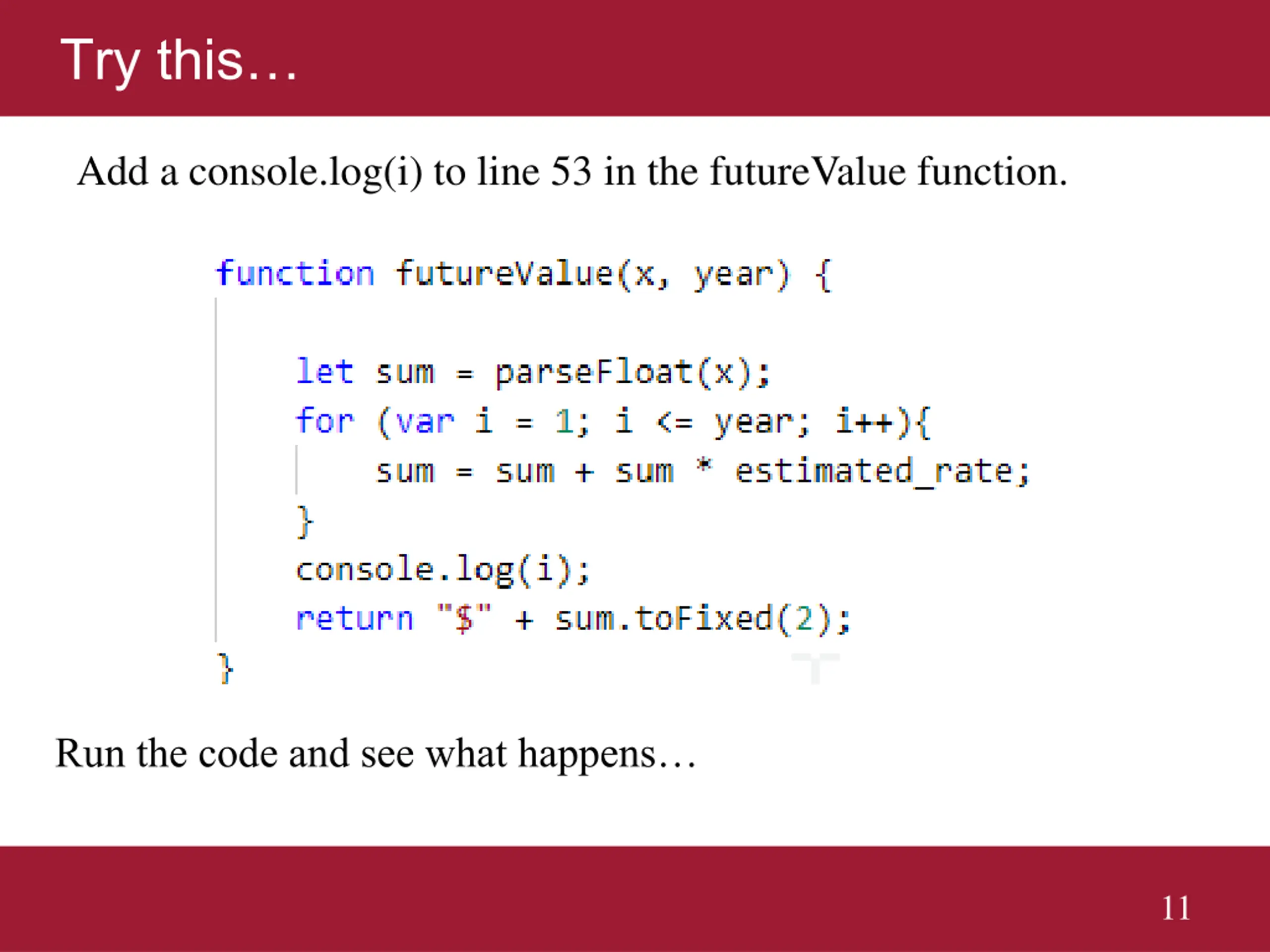 Try this Add a console.log(i) to line 53 in the futureValue function. Run the code and see what happens 11