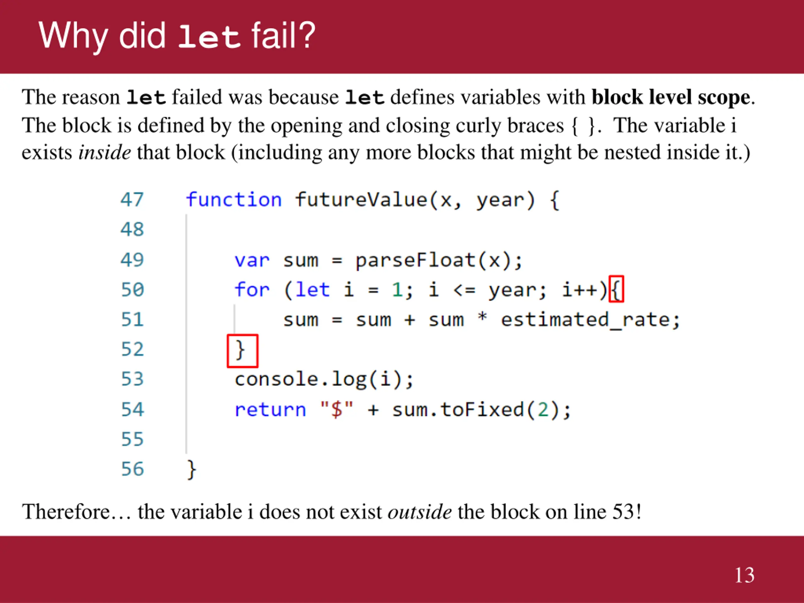 Why did let fail? The reason let failed was because let defines variables with block level scope. The block is defined by the opening and closing curly braces { }. The variable i exists inside that block (including any more blocks that might be nested inside it.) Therefore the variable i does not exist outside the block on line 53! 13