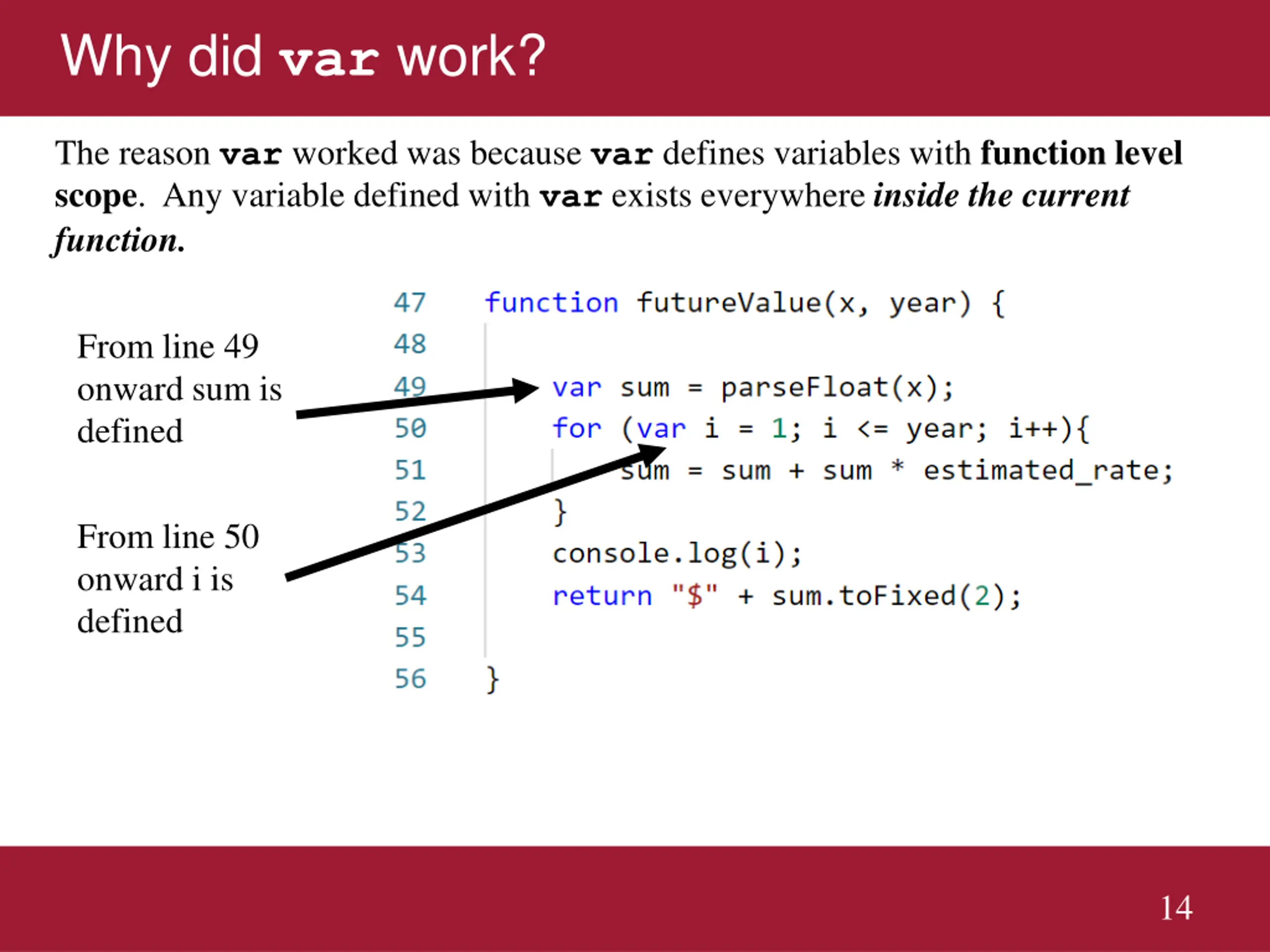 Why did var work? The reason var worked was because var defines variables with function level scope. Any variable defined with var exists everywhere inside the current function. From line 49 onward sum is defined From line 50 onward i is defined 14