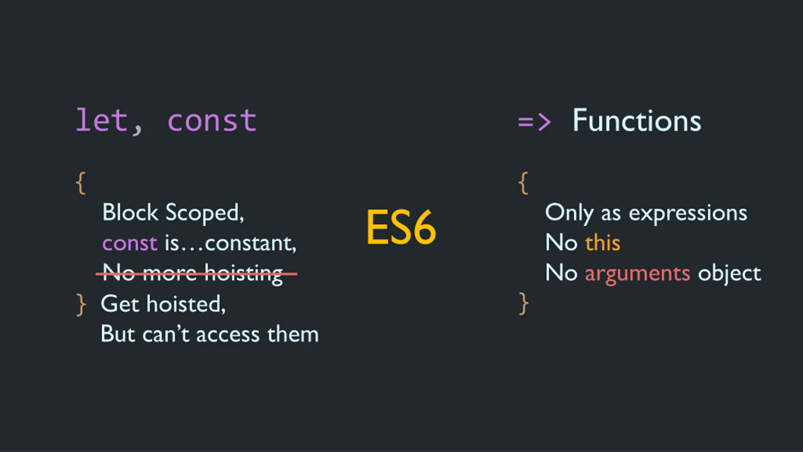 => Functions let, const { { Block Scoped, const is constant, No more hoisting } Get hoisted, But can t access them Only as expressions No this No arguments object ES6 }