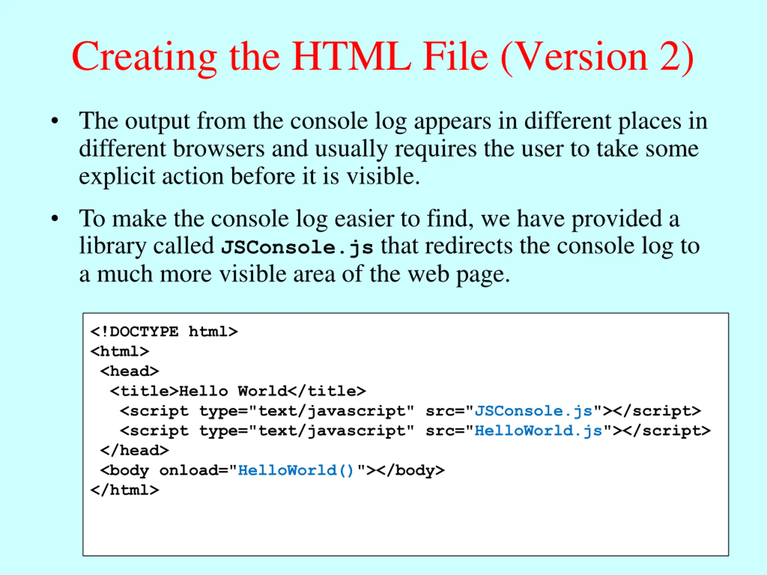 Creating the HTML File (Version 2) The output from the console log appears in different places in different browsers and usually requires the user to take some explicit action before it is visible. To make the console log easier to find, we have provided a library called JSConsole.js that redirects the console log to a much more visible area of the web page. <!DOCTYPE html> <html> <head> <title>Hello World</title> <script type="text/javascript" src="JSConsole.js"></script> <script type="text/javascript" src="HelloWorld.js"></script> </head> <body onload="HelloWorld()"></body> </html>