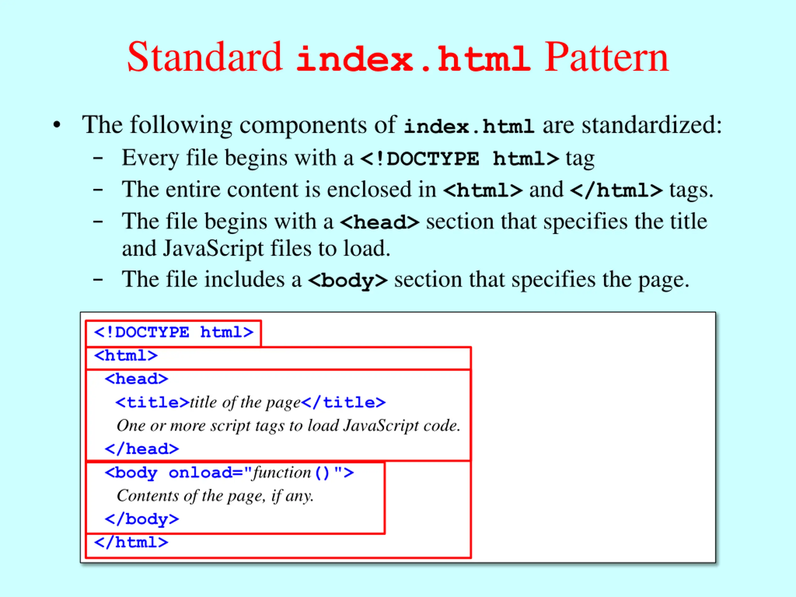 Standard index.html Pattern The following components of index.html are standardized: Every file begins with a <!DOCTYPE html> tag The entire content is enclosed in <html> and </html> tags. The file begins with a <head> section that specifies the title and JavaScript files to load. The file includes a <body> section that specifies the page. <!DOCTYPE html> <html> <head> <title>title of the page</title> One or more script tags to load JavaScript code. </head> <body onload="function()"> Contents of the page, if any. </body> </html>