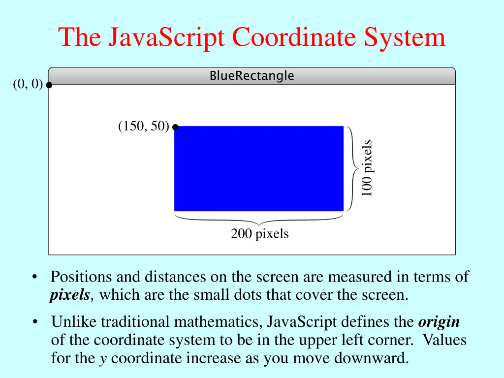 The JavaScript Coordinate System BlueRectangle (0, 0) pixels (150, 50) 100 pixels 200 pixels Positions and distances on the screen are measured in terms of pixels, which are the small dots that cover the screen. Unlike traditional mathematics, JavaScript defines the origin of the coordinate system to be in the upper left corner. Values for the y coordinate increase as you move downward.