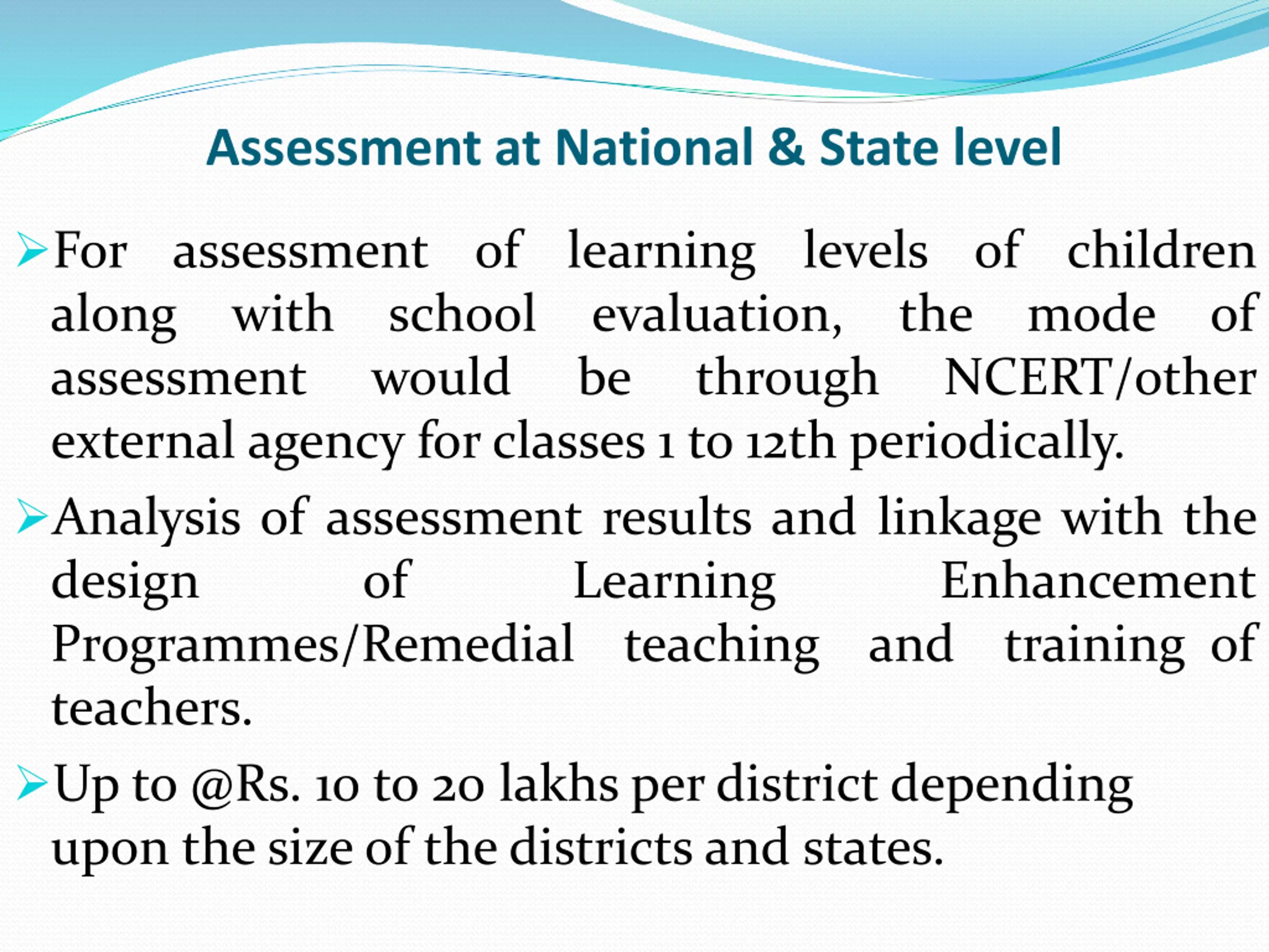 Assessment at National & State level For assessment of along with assessment external agency forclasses 1 to 12th periodically. Analysis of assessment results and linkage with the design of Learning Programmes/Remedial teaching teachers. Up to @Rs. 10 to 20 lakhs per district depending upon the size of the districts and states. learning levels of evaluation, be through children mode NCERT/other school would the of Enhancement and training of