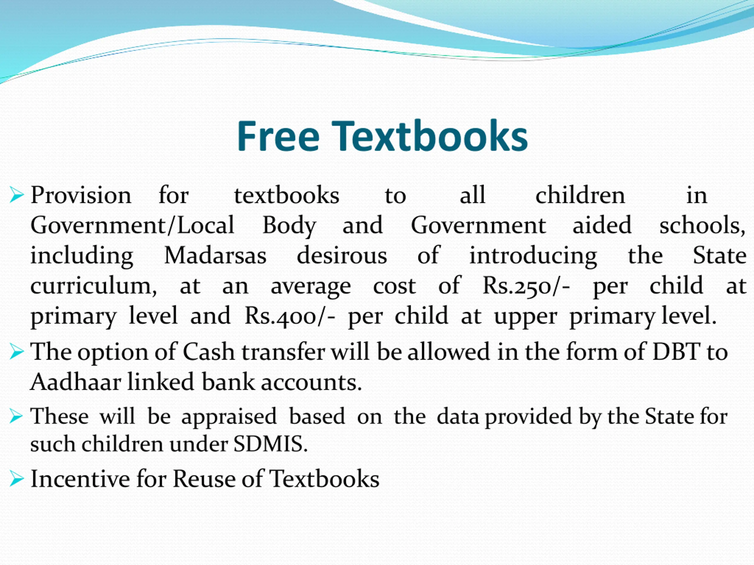 Free Textbooks Provision Government/Local including curriculum, at an average cost of Rs.250/- per child at primary level and Rs.400/- per child at upper primary level. The option of Cash transfer will be allowed in the form of DBT to Aadhaar linked bank accounts. These will be appraised based on the data provided by the State for such children under SDMIS. Incentive for Reuse of Textbooks for textbooks Body to all children aided in and Government of introducing schools, the Madarsas desirous State