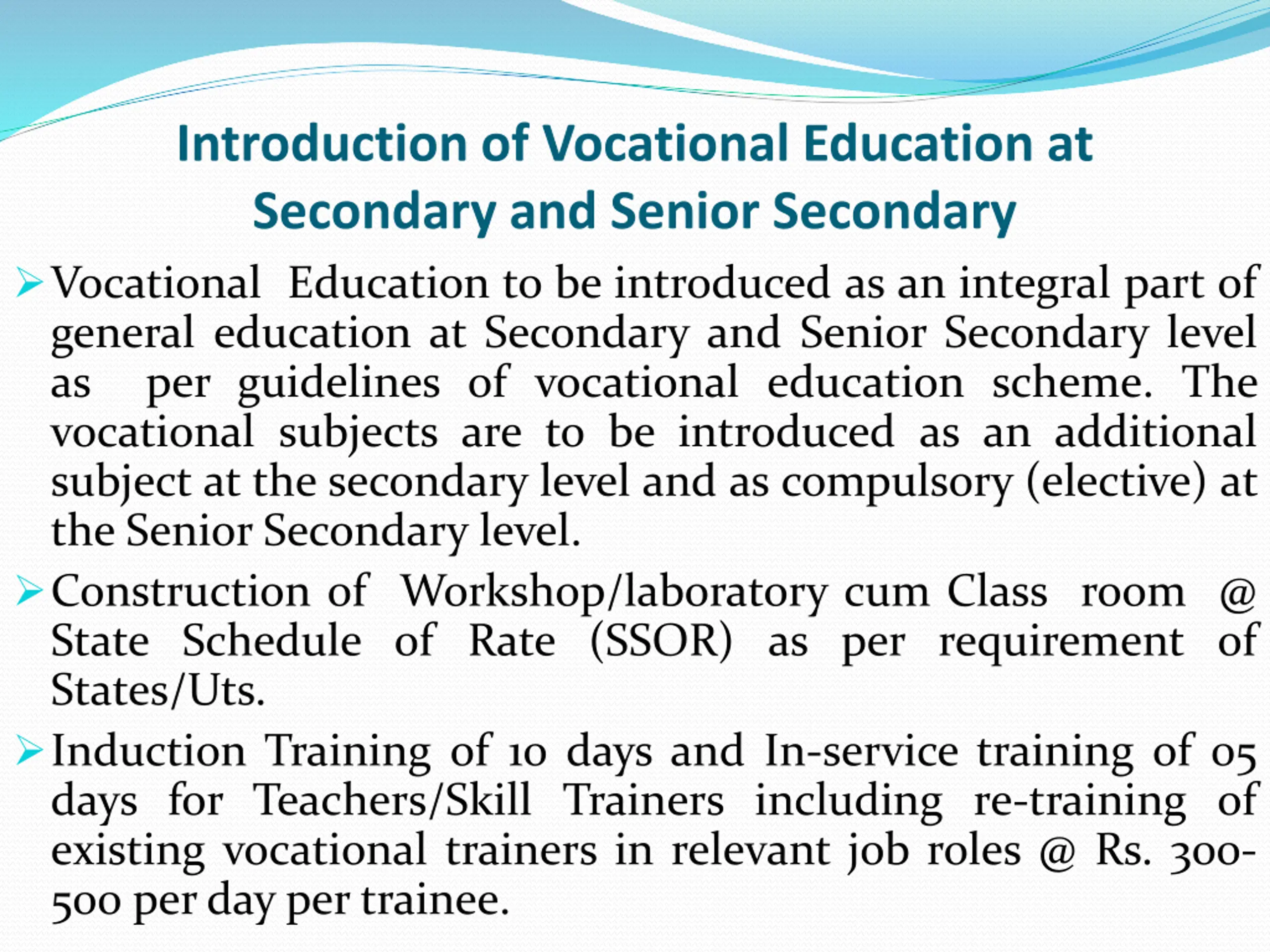 Introduction of Vocational Education at Secondary and Senior Secondary Vocational Education to be introduced as an integral part of general education at Secondary and Senior Secondary level as per guidelines of vocational education scheme. The vocational subjects are to be introduced as an additional subject at the secondary level and as compulsory (elective) at the Senior Secondary level. Construction of Workshop/laboratory cum Class room @ State Schedule of Rate (SSOR) as per requirement of States/Uts. Induction Training of 10 days and In-service training of 05 days for Teachers/Skill Trainers including re-training of existing vocational trainers in relevant job roles @ Rs. 300- 500 perday per trainee.