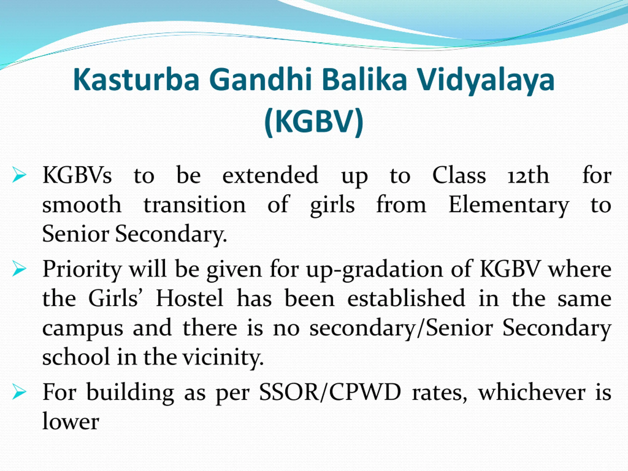 Kasturba Gandhi Balika Vidyalaya (KGBV) KGBVs to be extended up to Class 12th smooth transition of Senior Secondary. Priority will be given for up-gradation of KGBV where the Girls Hostel has been established in the same campus and there is no secondary/Senior Secondary school in thevicinity. For building as per SSOR/CPWD rates, whichever is lower for girls from Elementary to