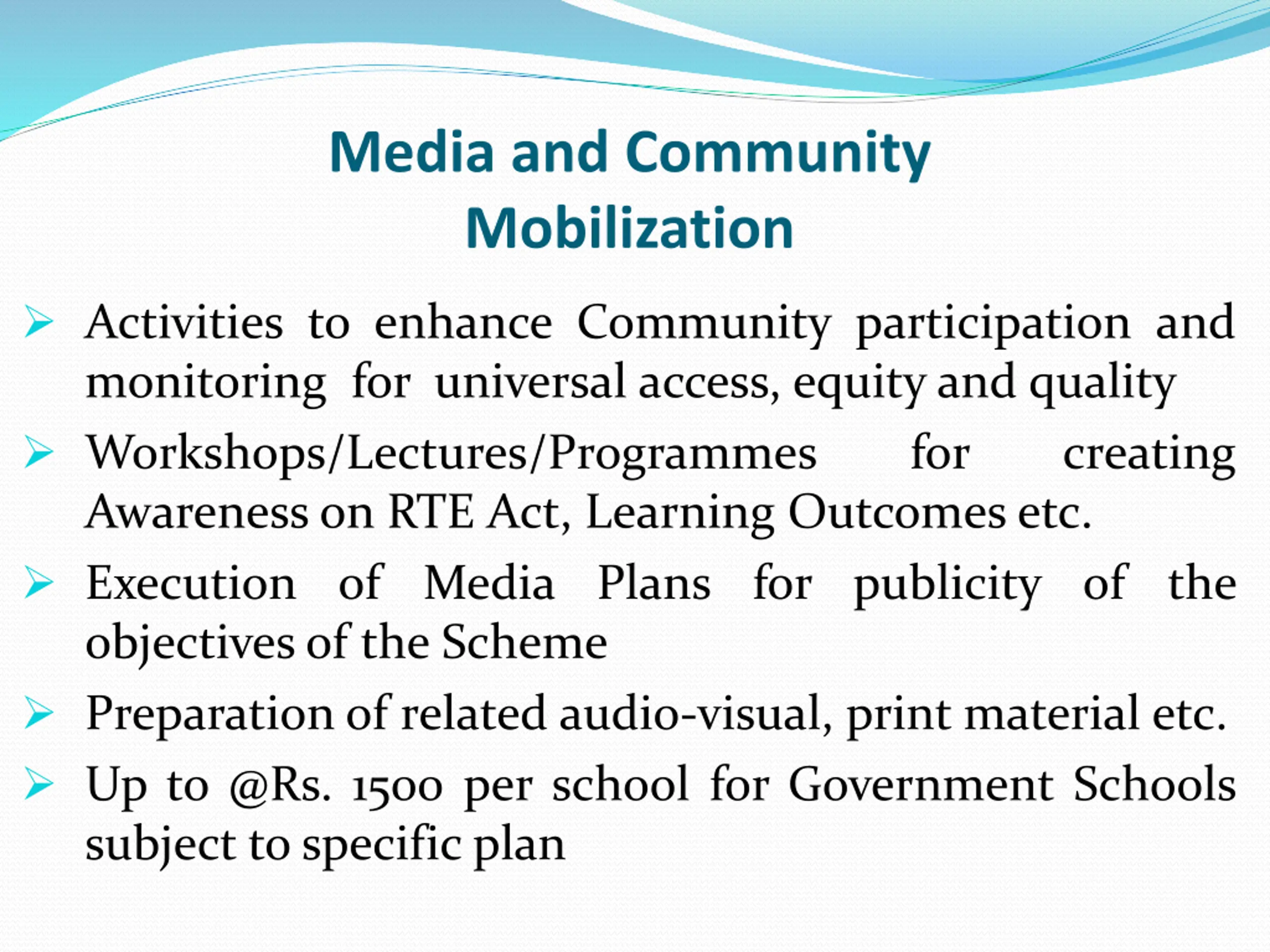 Media and Community Mobilization Activities to enhance Community participation and monitoring for universal access, equity and quality Workshops/Lectures/Programmes Awareness on RTE Act, Learning Outcomes etc. Execution of Media Plans for publicity of the objectives of the Scheme Preparation of related audio-visual, print material etc. Up to @Rs. 1500 per school for Government Schools subject to specific plan for creating