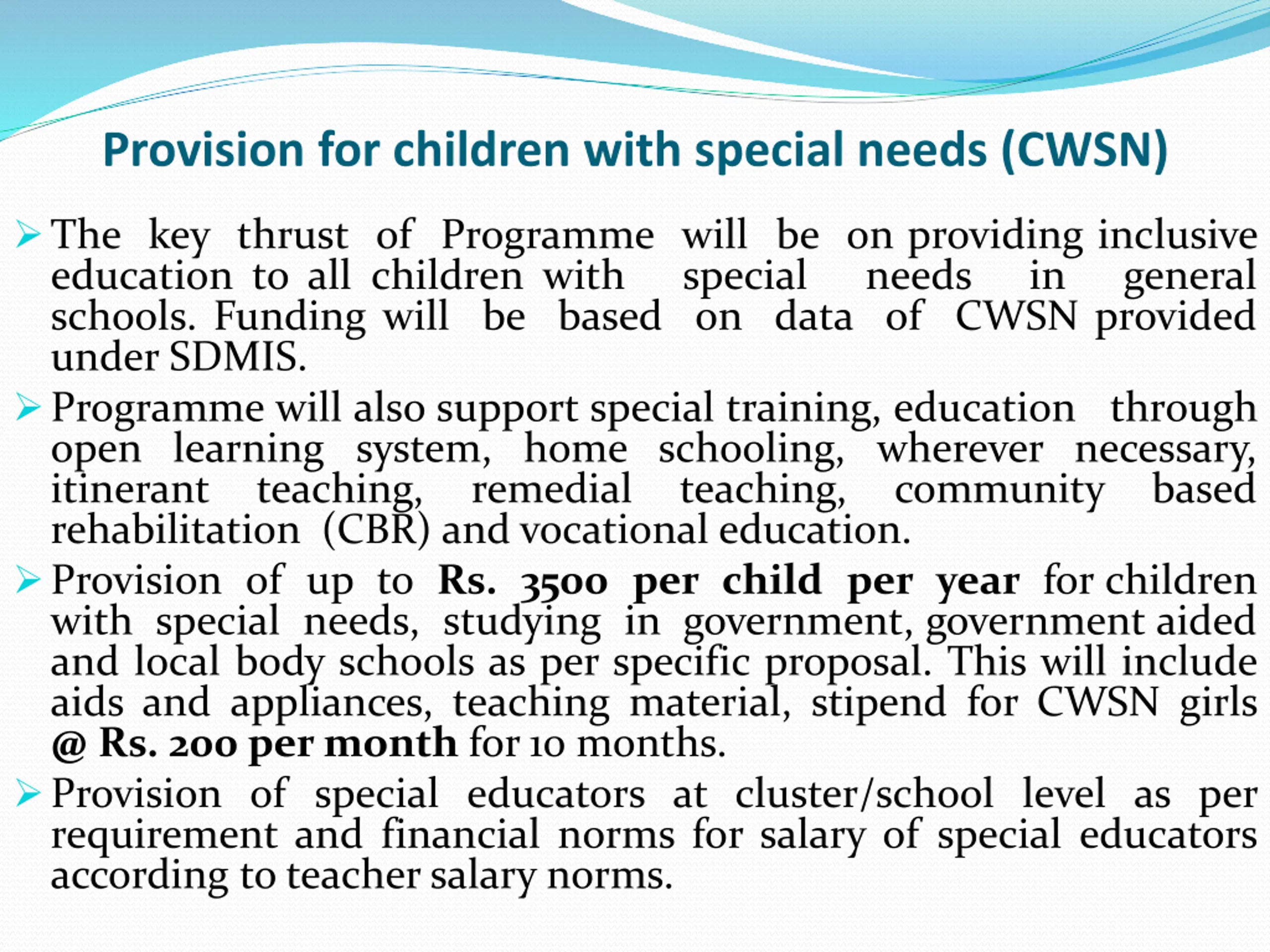 Provision for children with special needs (CWSN) The key thrust of Programme will be on providing inclusive education to all children with schools. Funding will be based on data of CWSN provided under SDMIS. Programme will also support special training, education through open learning system, home schooling, wherever necessary, itinerant teaching, remedial rehabilitation (CBR) and vocational education. Provision of up to Rs. 3500 per child per year for children with special needs, studying in government, government aided and local body schools as per specific proposal. This will include aids and appliances, teaching material, stipend for CWSN girls @ Rs. 200 per month for 10 months. Provision of special educators at cluster/school level as per requirement and financial norms for salary of special educators according to teachersalary norms. special needs in general teaching, community based