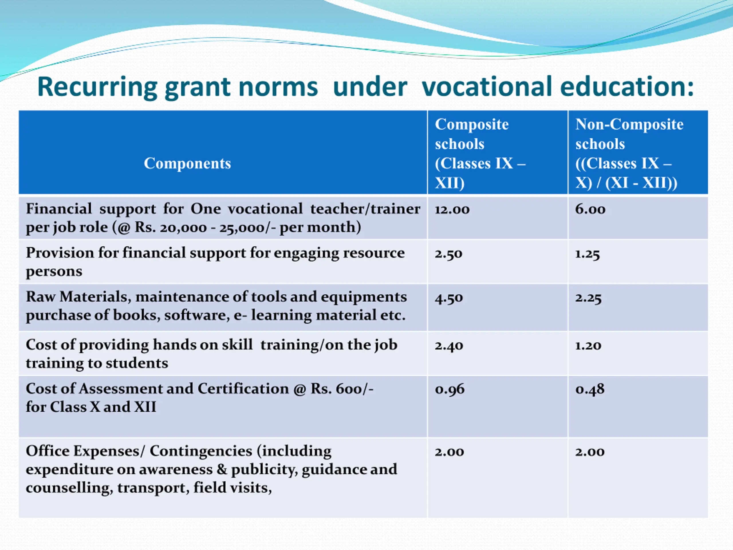Recurring grant norms under vocational education: Composite schools (Classes IX XII) Non-Composite schools ((Classes IX X) / (XI - XII)) Components Financial support for One vocational teacher/trainer per job role (@ Rs. 20,000 - 25,000/- per month) 12.00 6.00 Provision for financial support for engaging resource persons 2.50 1.25 Raw Materials, maintenance of tools and equipments purchase of books, software, e- learning material etc. 4.50 2.25 Cost of providing hands on skill training/on the job training to students 2.40 1.20 Cost of Assessment and Certification @ Rs. 600/- for Class X and XII 0.96 0.48 Office Expenses/ Contingencies (including expenditure on awareness & publicity, guidance and counselling, transport, field visits, 2.00 2.00