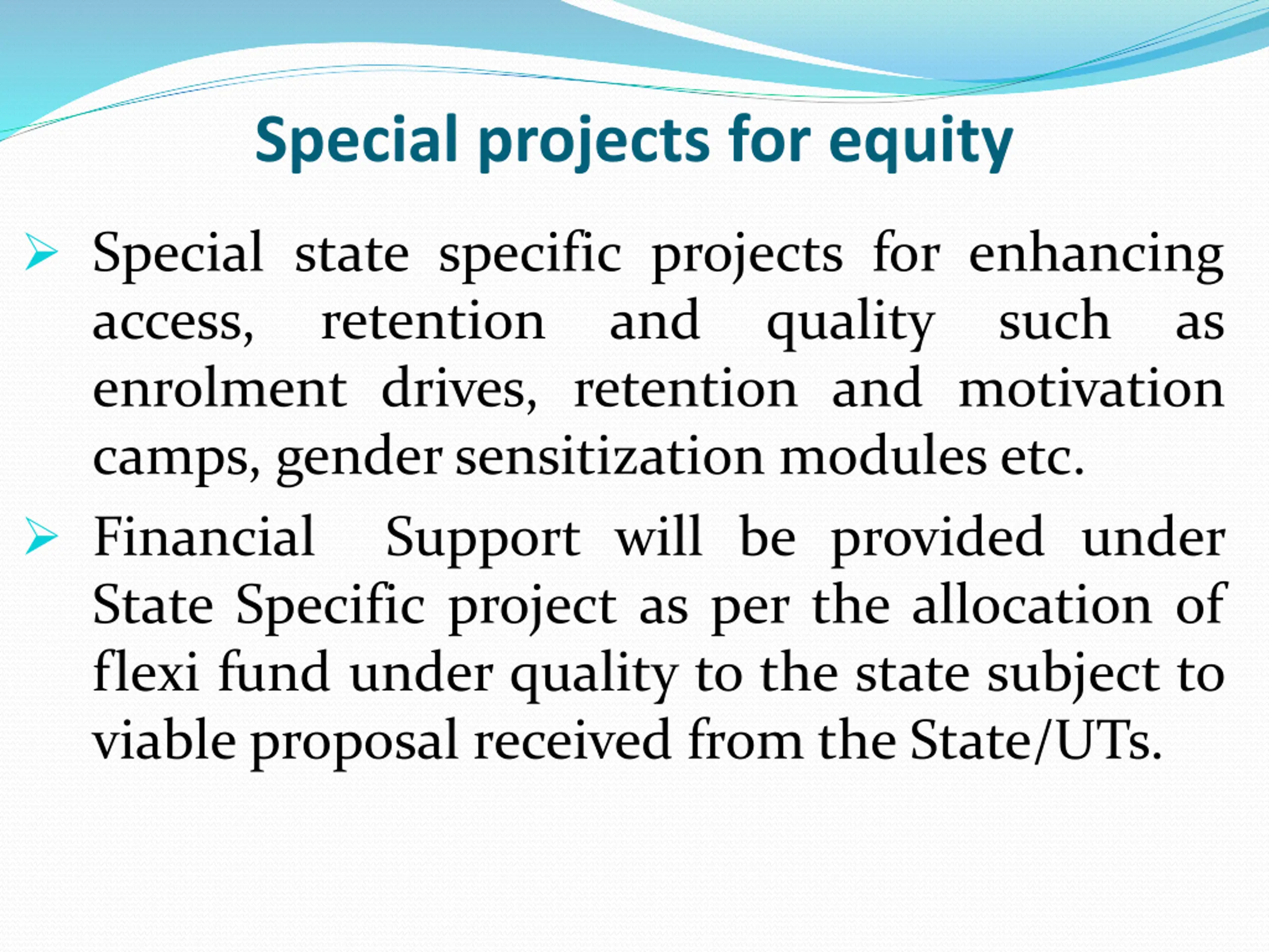 Special projects for equity Special state specific projects for enhancing access, retention and enrolment drives, retention and motivation camps, gendersensitization modules etc. Financial Support will be provided under State Specific project as per the allocation of flexi fund under quality to the state subject to viable proposal received from the State/UTs. quality such as