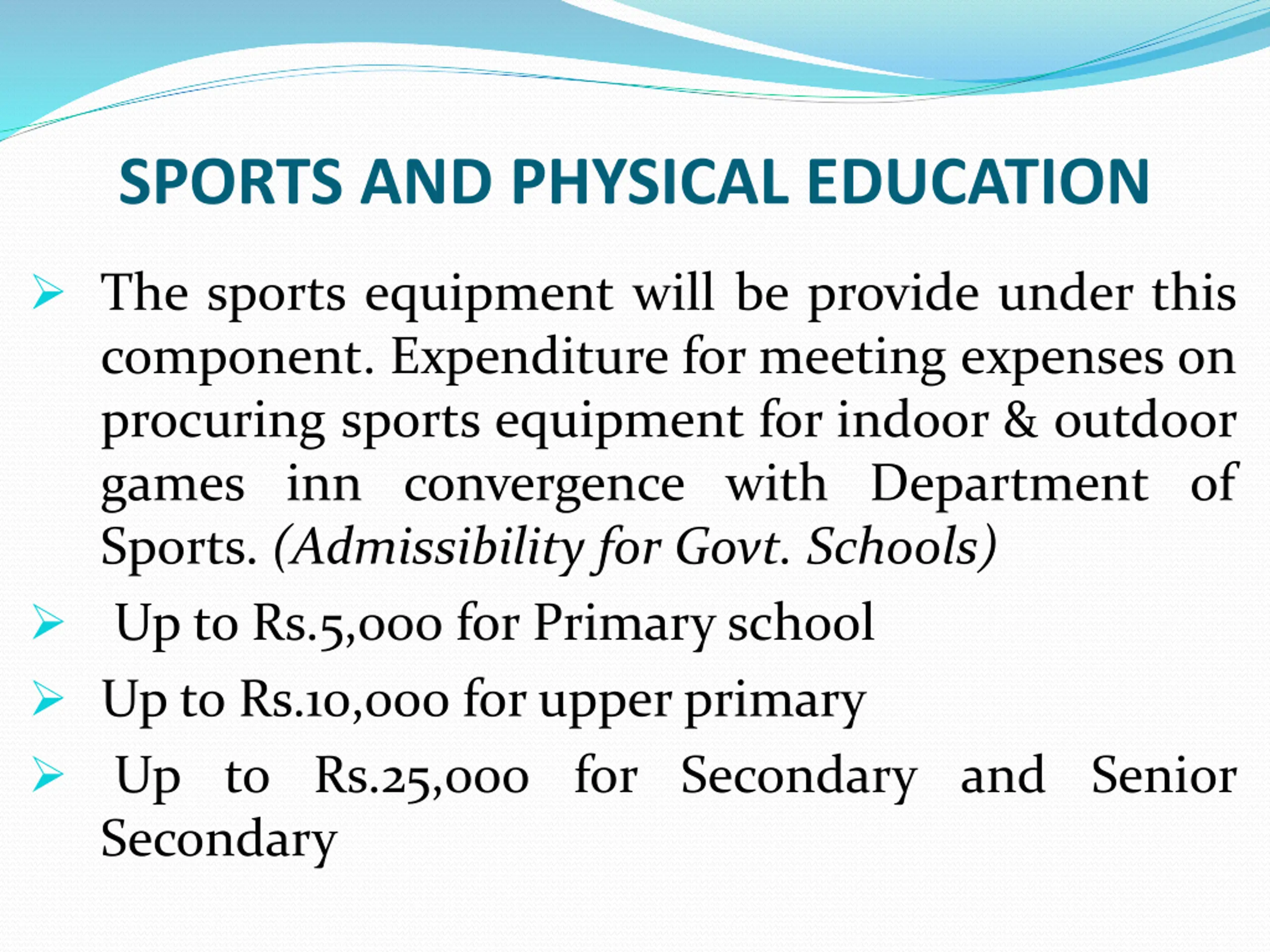 SPORTS AND PHYSICAL EDUCATION The sports equipment will be provide under this component. Expenditure for meeting expenses on procuring sports equipment for indoor & outdoor games inn convergence with Department of Sports. (Admissibility for Govt. Schools) Up to Rs.5,000 for Primary school Up to Rs.10,000 for upper primary Up to Rs.25,000 for Secondary and Senior Secondary