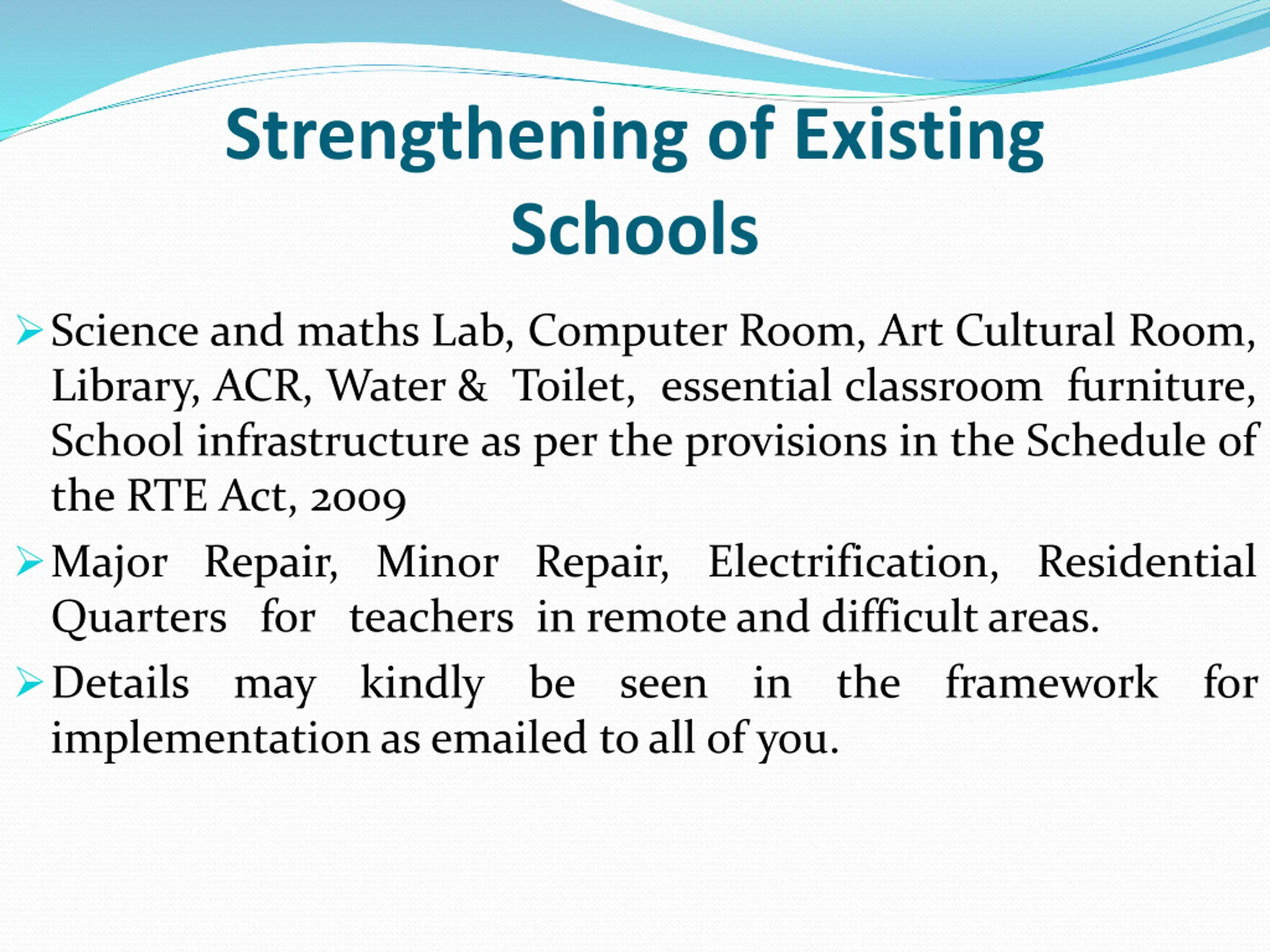 Strengthening of Existing Schools Science and maths Lab, Computer Room, Art Cultural Room, Library, ACR, Water & Toilet, essential classroom furniture, School infrastructure as per the provisions in the Schedule of the RTE Act, 2009 Major Repair, Minor Repair, Electrification, Residential Quarters for teachers in remoteand difficultareas. Details may kindly be seen implementationas emailed toall of you. in the framework for
