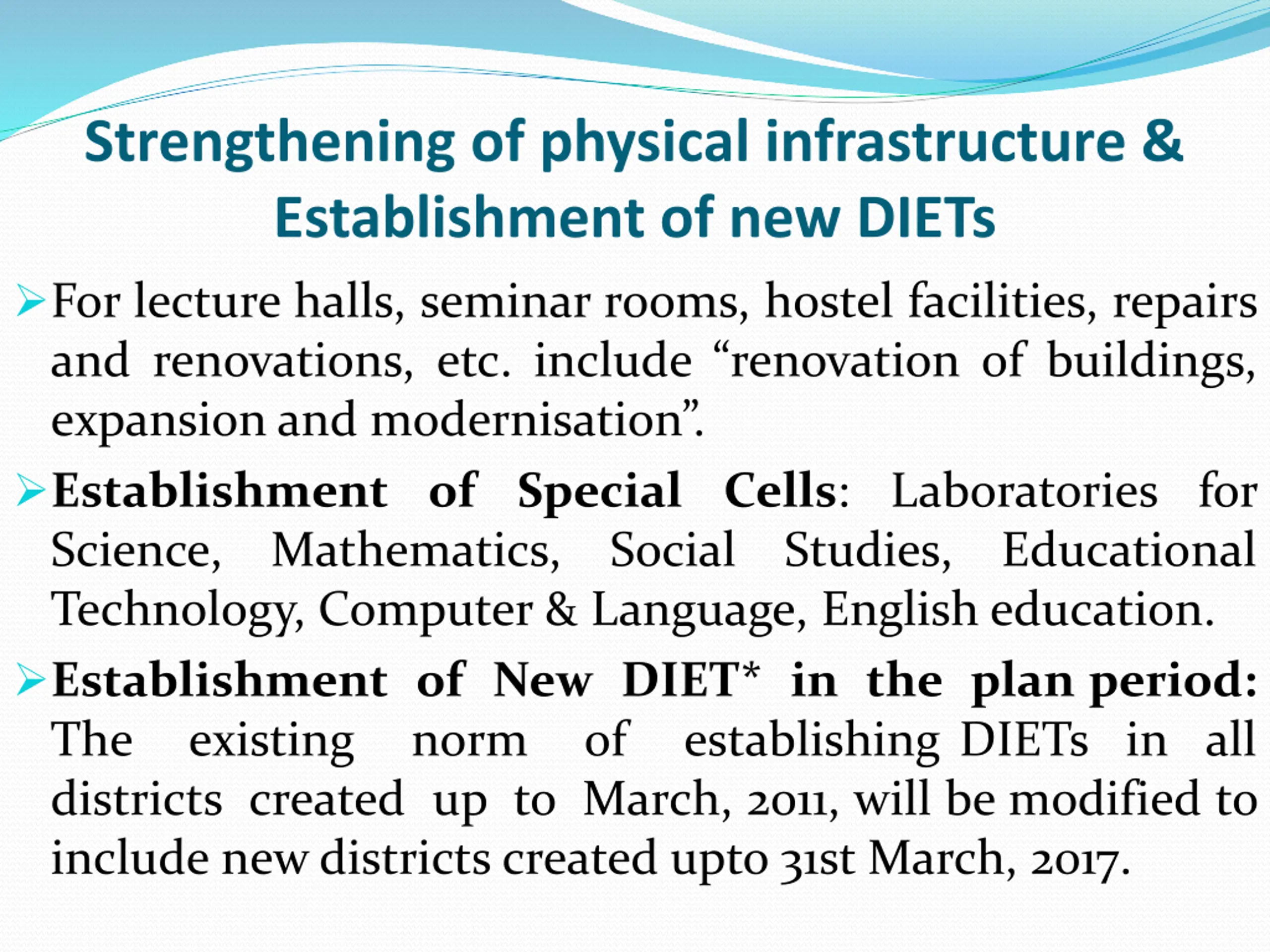 Strengthening of physical infrastructure & Establishment of new DIETs For lecture halls, seminar rooms, hostel facilities, repairs and renovations, etc. include renovation of buildings, expansion and modernisation . Establishment of Special Cells: Laboratories for Science, Mathematics, Social Technology, Computer & Language, English education. Establishment of New DIET* in the plan period: The existing norm of districts created up to March, 2011, will be modified to include newdistricts created upto 31st March, 2017. Studies, Educational establishing DIETs in all