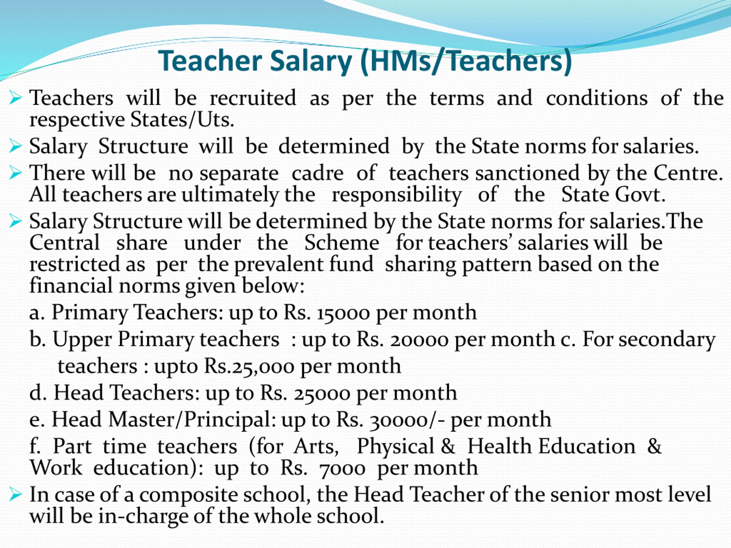 Teacher Salary (HMs/Teachers) Teachers will be recruited as per the terms and conditions of the respective States/Uts. Salary Structure will be determined by the State norms forsalaries. There will be no separate cadre of teachers sanctioned by the Centre. All teachers are ultimately the responsibility of the State Govt. Salary Structure will be determined by the State norms for salaries.The Central share under the Scheme for teachers salaries will be restricted as per the prevalent fund sharing pattern based on the financial norms given below: a. Primary Teachers: up to Rs. 15000 per month b. Upper Primary teachers : up to Rs. 20000 per month c. For secondary teachers : upto Rs.25,000 per month d. Head Teachers: up to Rs. 25000 per month e. Head Master/Principal: up to Rs. 30000/- per month f. Part time teachers (for Arts, Physical & Health Education & Work education): up to Rs. 7000 per month In case of a composite school, the Head Teacher of the senior most level will be in-charge of the whole school.