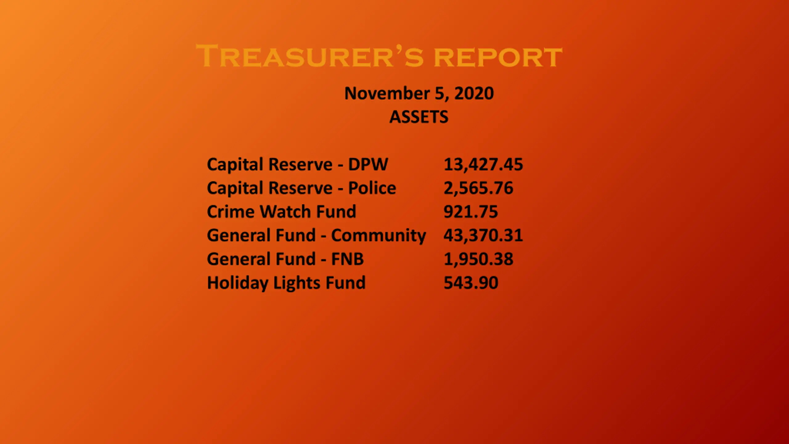 Treasurers report November 5, 2020 ASSETS Capital Reserve - DPW Capital Reserve - Police Crime Watch Fund General Fund - Community 43,370.31 General Fund - FNB Holiday Lights Fund 13,427.45 2,565.76 921.75 1,950.38 543.90