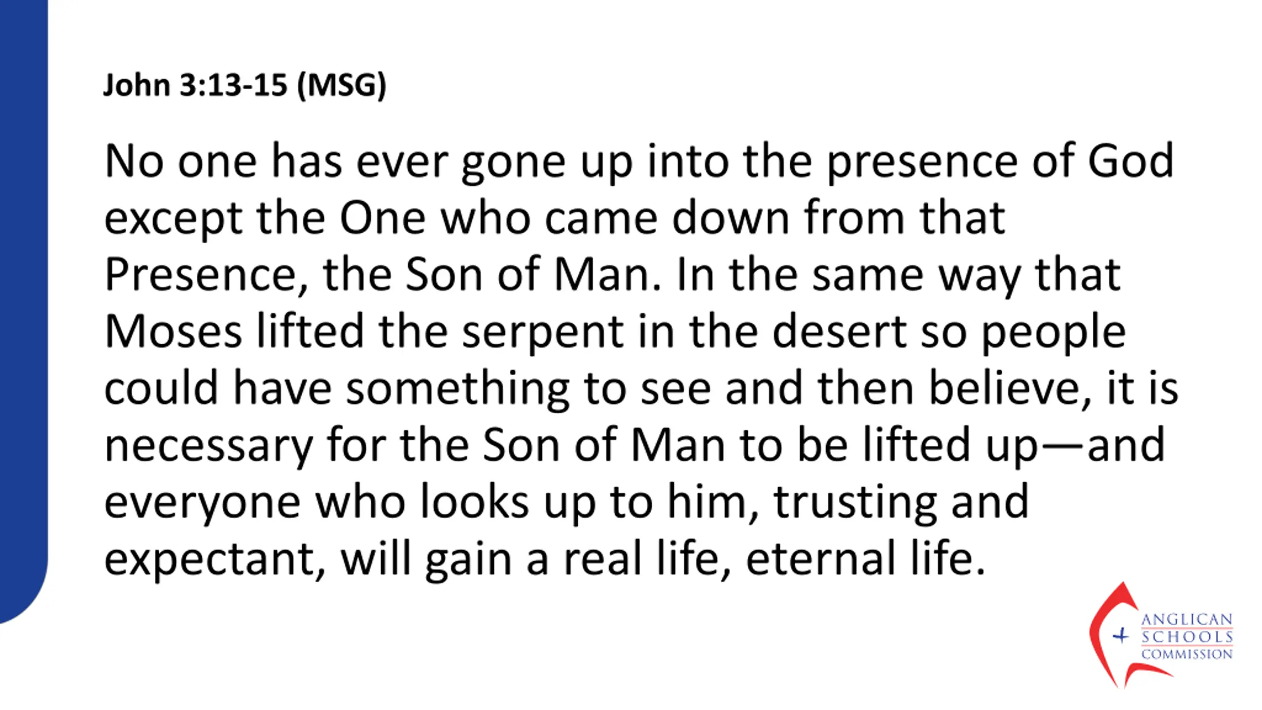 John 3:13-15 (MSG) No one has ever gone up into the presence of God except the One who came down from that Presence, the Son of Man. In the same way that Moses lifted the serpent in the desert so people could have something to see and then believe, it is necessary for the Son of Man to be lifted up and everyone who looks up to him, trusting and expectant, will gain a real life, eternal life.