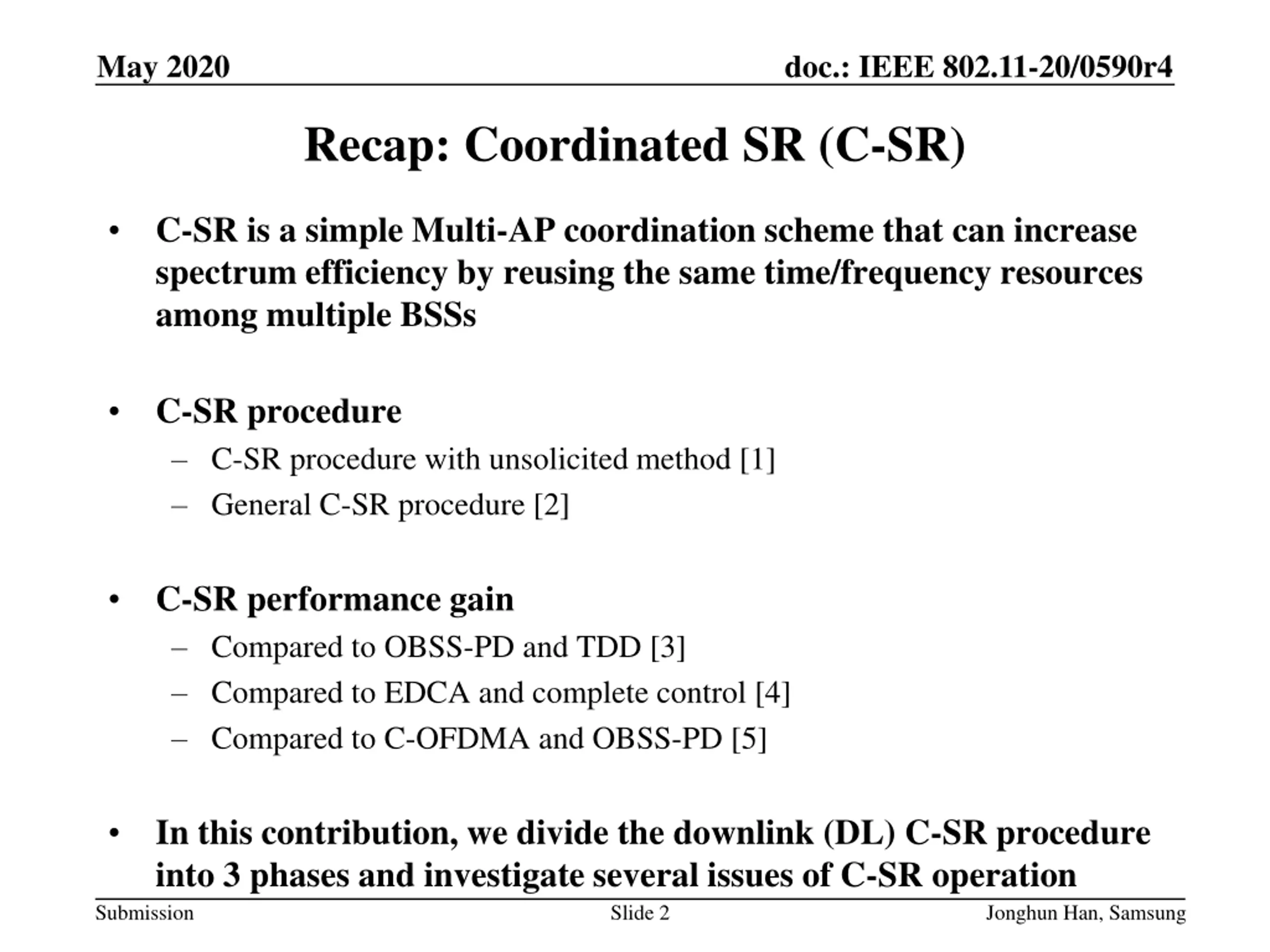 May 2020 doc.: IEEE 802.11-20/0590r4 Recap: Coordinated SR (C-SR) C-SR is a simple Multi-AP coordination scheme that can increase spectrum efficiency by reusing the same time/frequency resources among multiple BSSs C-SR procedure C-SR procedure with unsolicited method [1] General C-SR procedure [2] C-SR performance gain Compared to OBSS-PD and TDD [3] Compared to EDCA and complete control [4] Compared to C-OFDMA and OBSS-PD [5] In this contribution, we divide the downlink (DL) C-SR procedure into 3 phases and investigate several issues of C-SR operation Slide 2 Submission Jonghun Han, Samsung