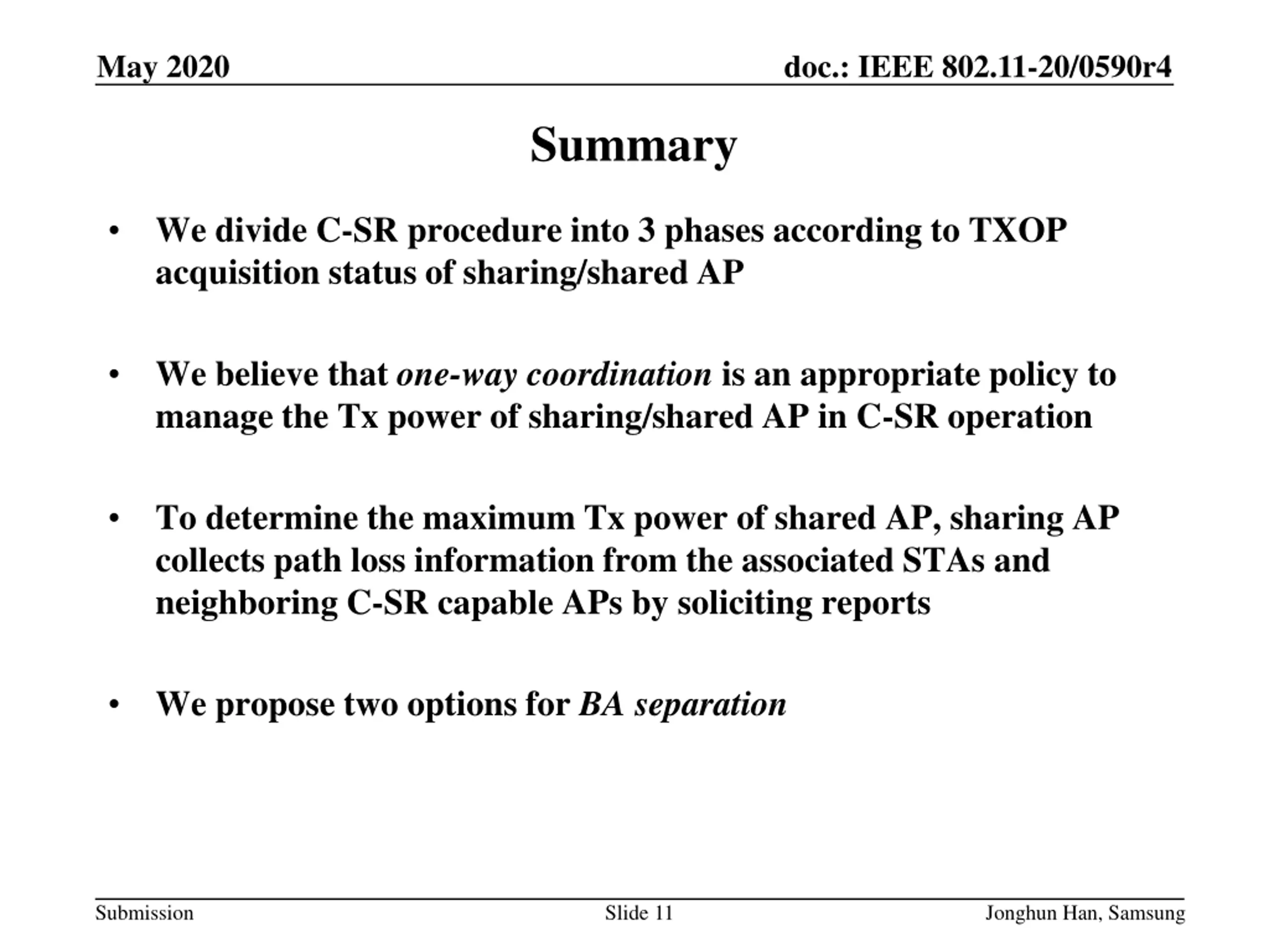 May 2020 doc.: IEEE 802.11-20/0590r4 Summary We divide C-SR procedure into 3 phases according to TXOP acquisition status of sharing/shared AP We believe that one-way coordination is an appropriate policy to manage the Tx power of sharing/shared AP in C-SR operation To determine the maximum Tx power of shared AP, sharing AP collects path loss information from the associated STAs and neighboring C-SR capable APs by soliciting reports We propose two options for BA separation Submission Slide 11 Jonghun Han, Samsung