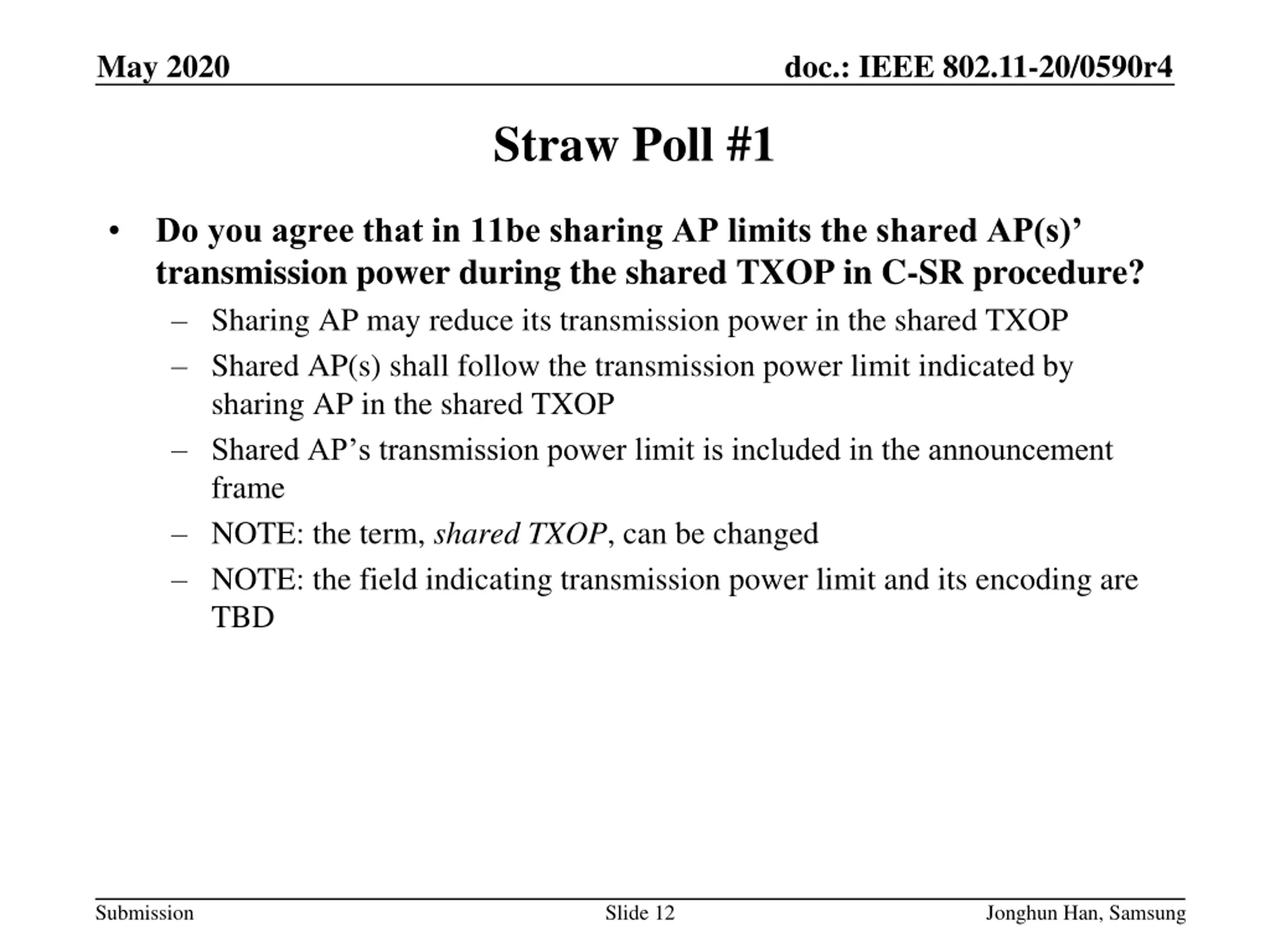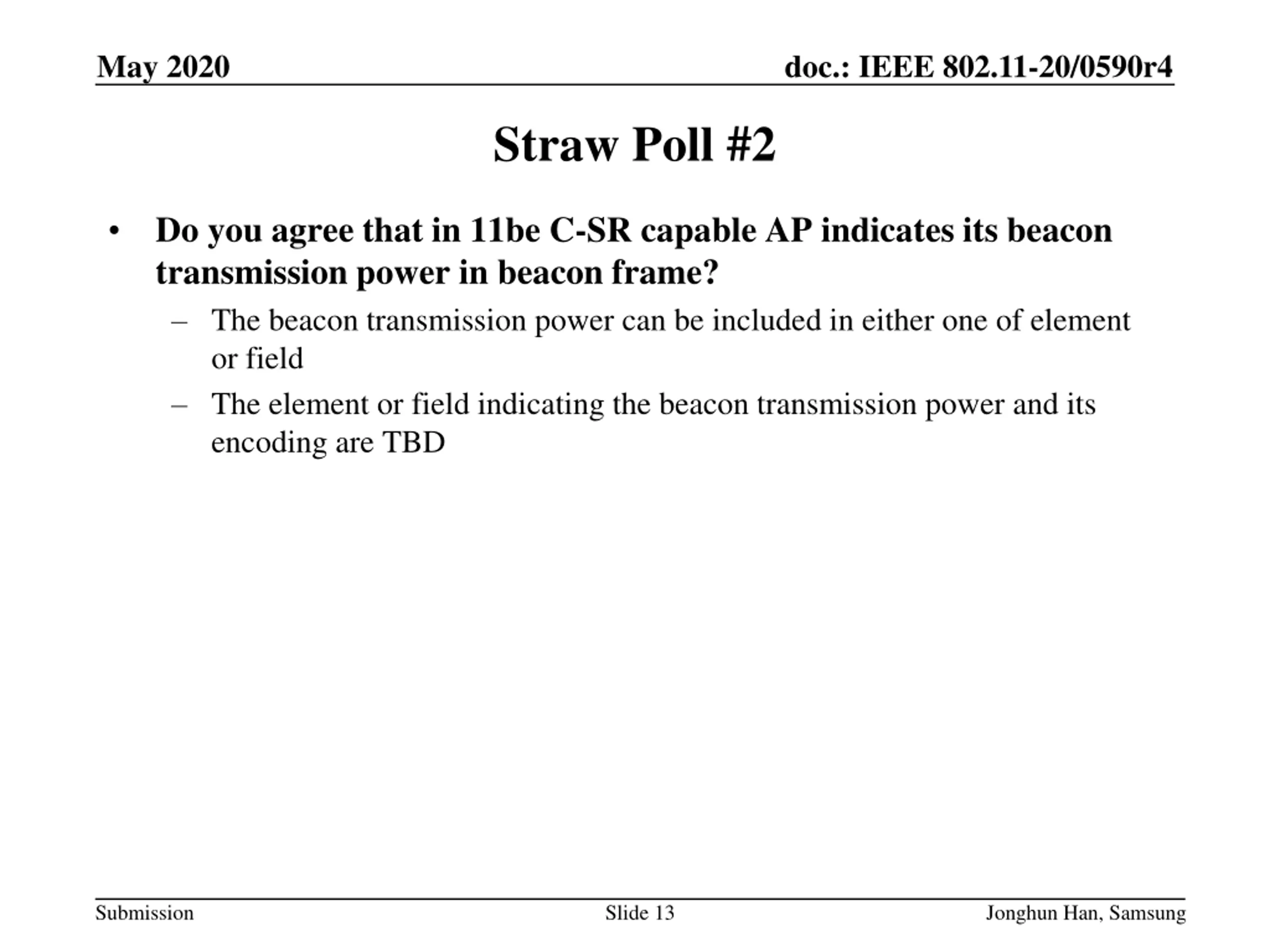 May 2020 doc.: IEEE 802.11-20/0590r4 Straw Poll #1 Do you agree that in 11be sharing AP limits the shared AP(s) transmission power during the shared TXOP in C-SR procedure? Sharing AP may reduce its transmission power in the shared TXOP Shared AP(s) shall follow the transmission power limit indicated by sharing AP in the shared TXOP Shared AP s transmission power limit is included in the announcement frame NOTE: the term, shared TXOP, can be changed NOTE: the field indicating transmission power limit and its encoding are TBD Submission Slide 12 Jonghun Han, Samsung