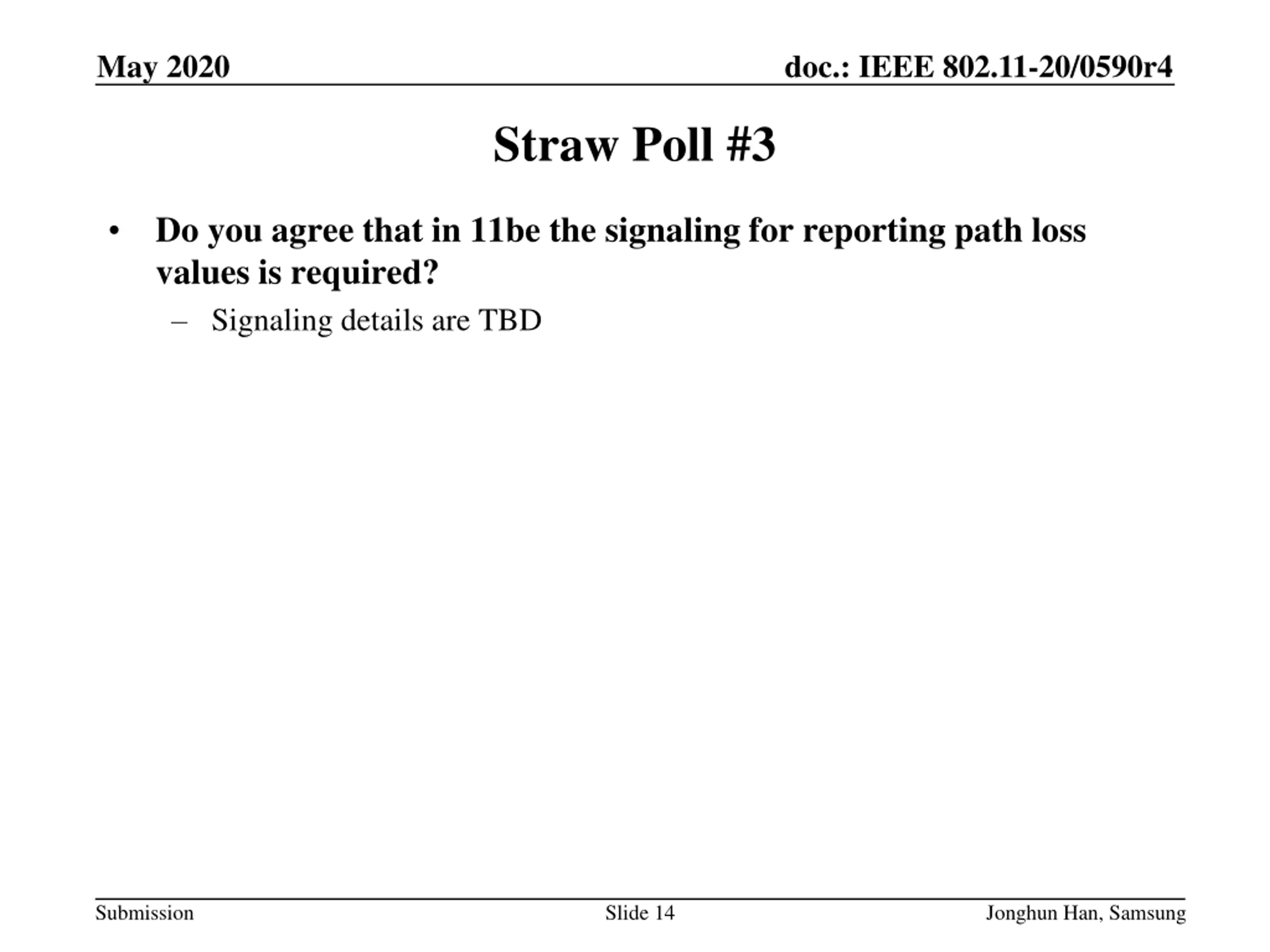 May 2020 doc.: IEEE 802.11-20/0590r4 Straw Poll #3 Do you agree that in 11be the signaling for reporting path loss values is required? Signaling details are TBD Submission Slide 14 Jonghun Han, Samsung