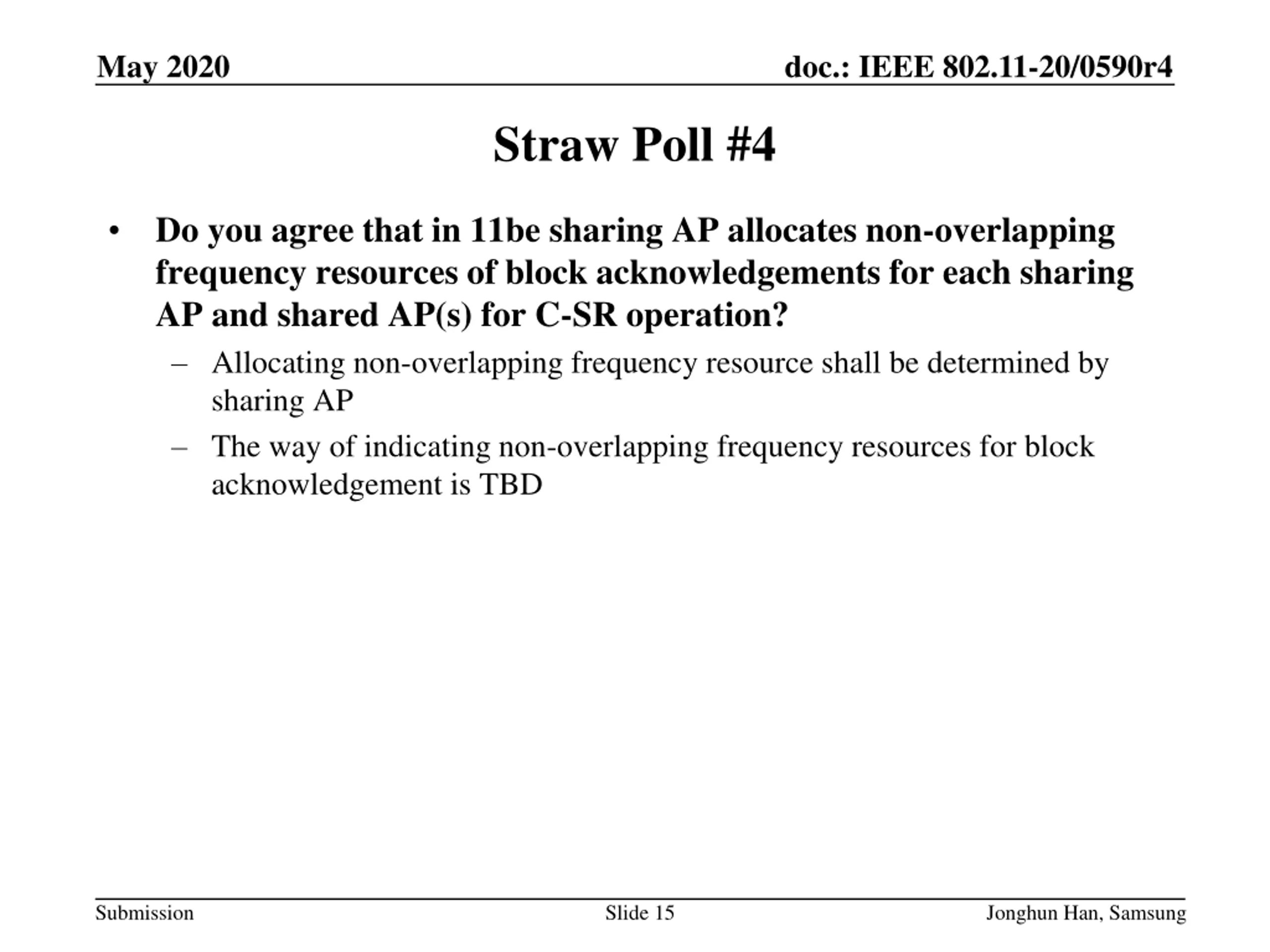 May 2020 doc.: IEEE 802.11-20/0590r4 Straw Poll #4 Do you agree that in 11be sharing AP allocates non-overlapping frequency resources of block acknowledgements for each sharing AP and shared AP(s) for C-SR operation? Allocating non-overlapping frequency resource shall be determined by sharing AP The way of indicating non-overlapping frequency resources for block acknowledgement is TBD Submission Slide 15 Jonghun Han, Samsung