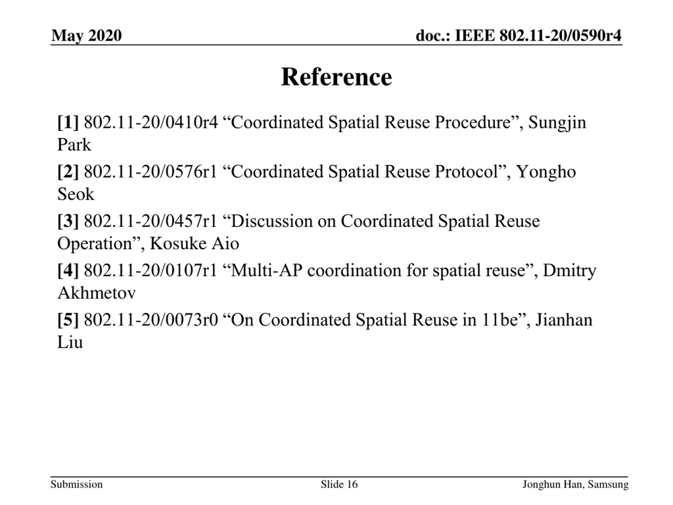 May 2020 doc.: IEEE 802.11-20/0590r4 Reference [1] 802.11-20/0410r4 Coordinated Spatial Reuse Procedure , Sungjin Park [2] 802.11-20/0576r1 Coordinated Spatial Reuse Protocol , Yongho Seok [3] 802.11-20/0457r1 Discussion on Coordinated Spatial Reuse Operation , Kosuke Aio [4] 802.11-20/0107r1 Multi-AP coordination for spatial reuse , Dmitry Akhmetov [5] 802.11-20/0073r0 On Coordinated Spatial Reuse in 11be , Jianhan Liu Submission Slide 16 Jonghun Han, Samsung