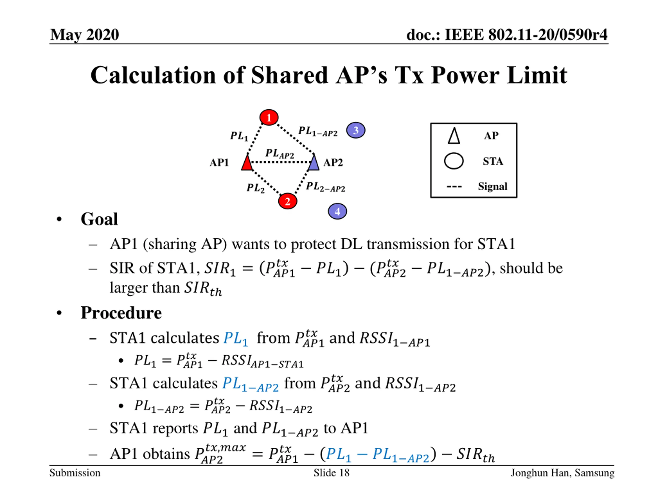 May 2020 doc.: IEEE 802.11-20/0590r4 Calculation of Shared AP s Tx Power Limit 1 3 ??? ??? AP ??? ????? STA AP1 AP2 Signal ??? ??? ??? 2 4 Goal AP1 (sharing AP) wants to protect DL transmission for STA1 SIR of STA1, ???1= ???1 larger than ???? Procedure STA1 calculates ??1 from ???1 ??1= ???1 STA1 calculates ??1 ??2 from ???2 ??1 ??2= ???2 STA1 reports ??1 and ??1 ??2 to AP1 AP1 obtains ???2 ?? ??1 (???2 ?? ??1 ??2), should be ?? and ????1 ??1 ?? ??????1 ???1 ?? and ????1 ??2 ?? ????1 ??2 ??,???= ???1 ?? ??1 ??1 ??2 ???? Slide 18 Submission Jonghun Han, Samsung