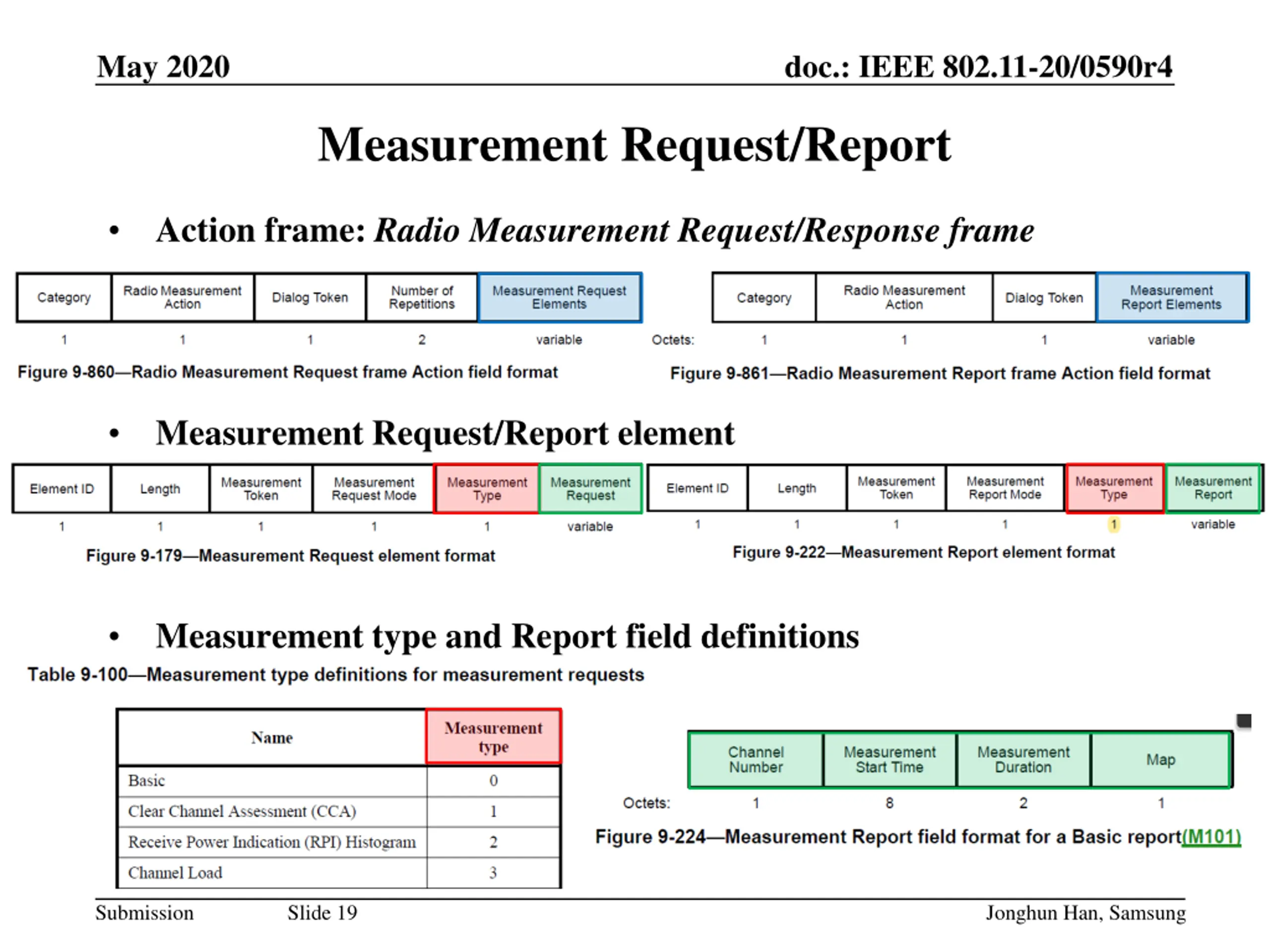 May 2020 doc.: IEEE 802.11-20/0590r4 Measurement Request/Report Action frame: Radio Measurement Request/Response frame Measurement Request/Report element Measurement type and Report field definitions Submission Slide 19 Jonghun Han, Samsung