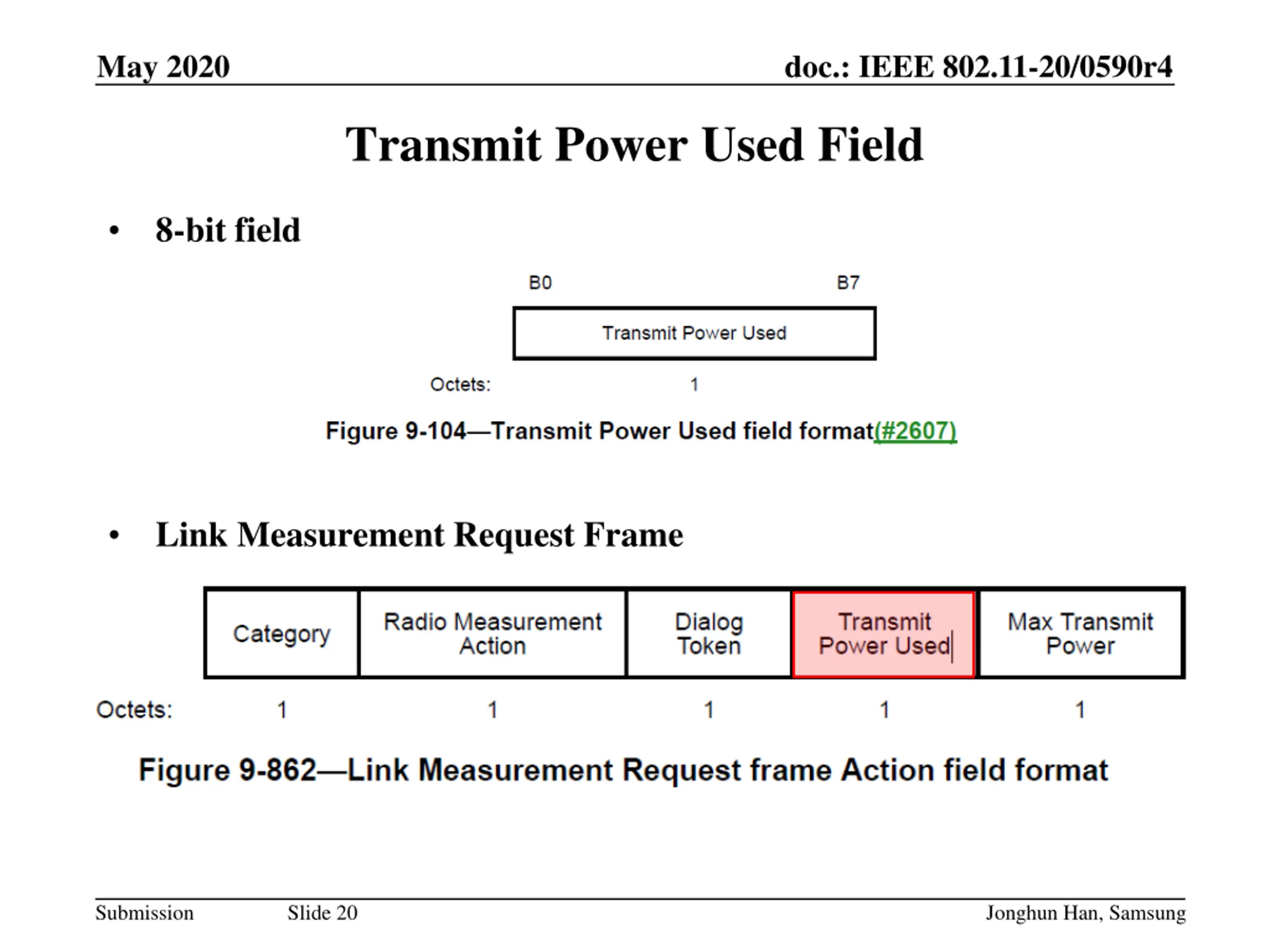 May 2020 doc.: IEEE 802.11-20/0590r4 Transmit Power Used Field 8-bit field Link Measurement Request Frame Submission Slide 20 Jonghun Han, Samsung