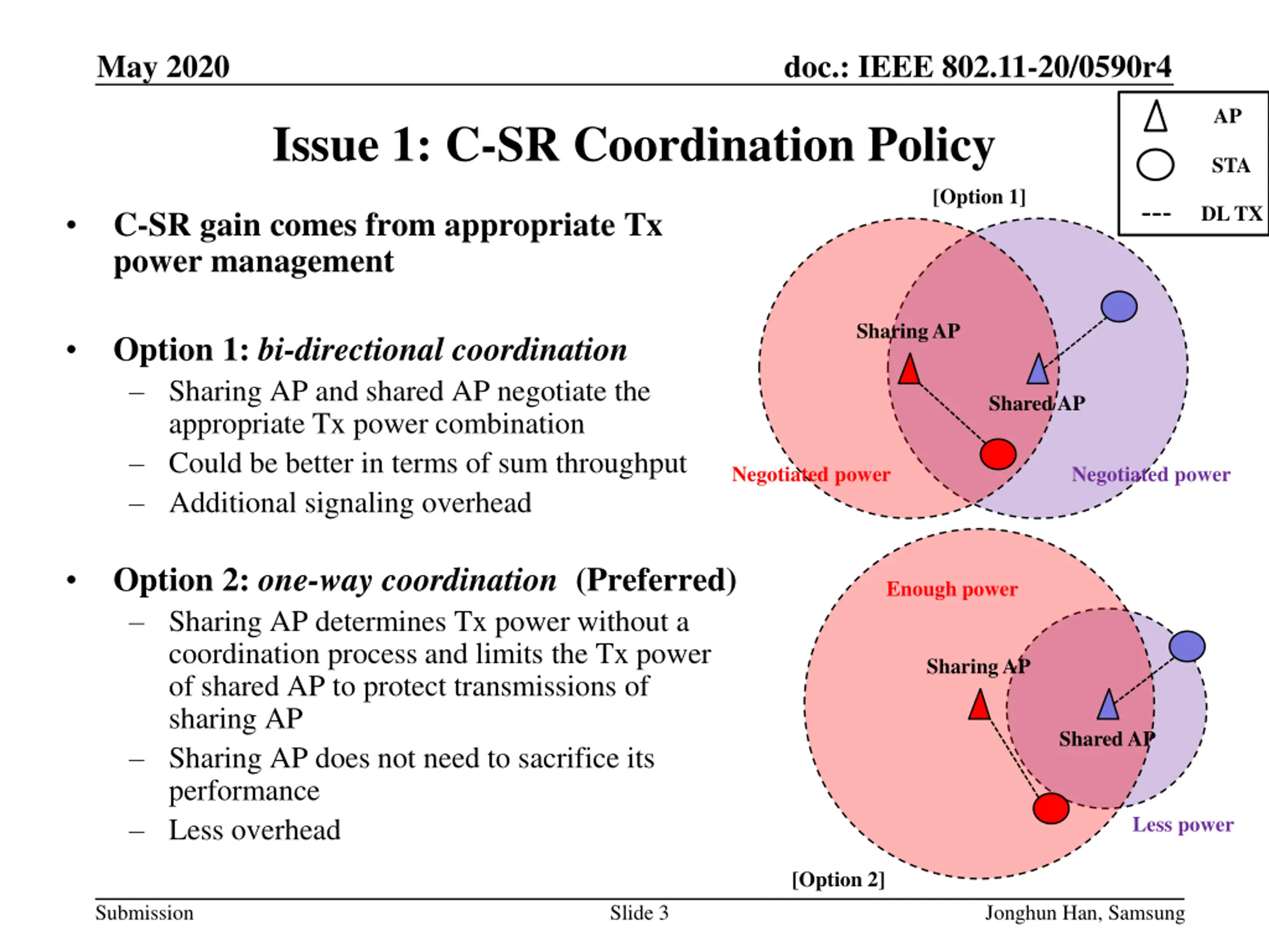 May 2020 doc.: IEEE 802.11-20/0590r4 AP Issue 1: C-SR Coordination Policy STA [Option 1] DL TX C-SR gain comes from appropriate Tx power management Sharing AP Option 1: bi-directional coordination Sharing AP and shared AP negotiate the appropriate Tx power combination Could be better in terms of sum throughput Additional signaling overhead Shared AP Negotiated power Negotiated power Option 2: one-way coordination (Preferred) Sharing AP determines Tx power without a coordination process and limits the Tx power of shared AP to protect transmissions of sharing AP Sharing AP does not need to sacrifice its performance Less overhead Enough power Sharing AP Shared AP Less power [Option 2] Submission Slide 3 Jonghun Han, Samsung