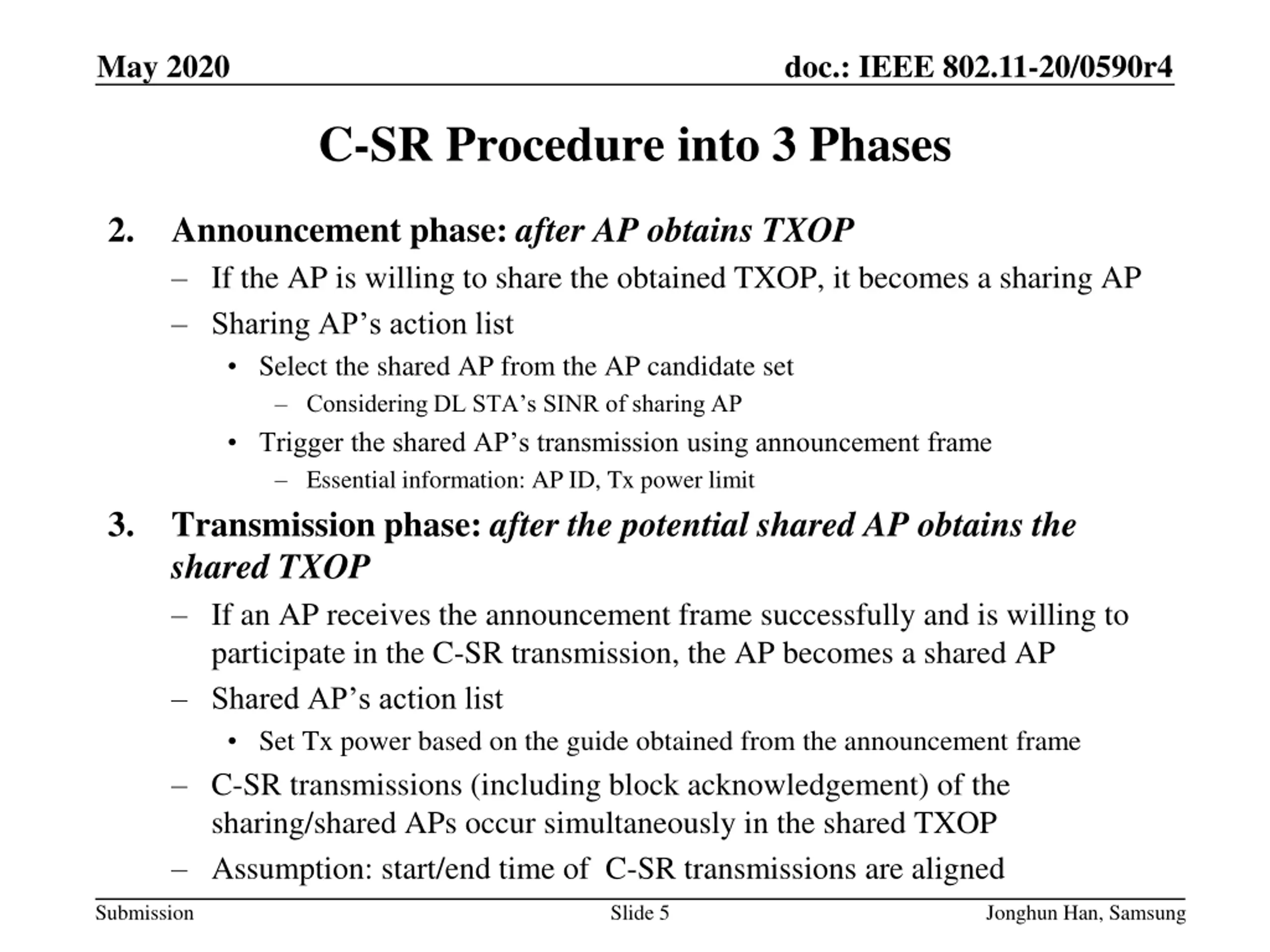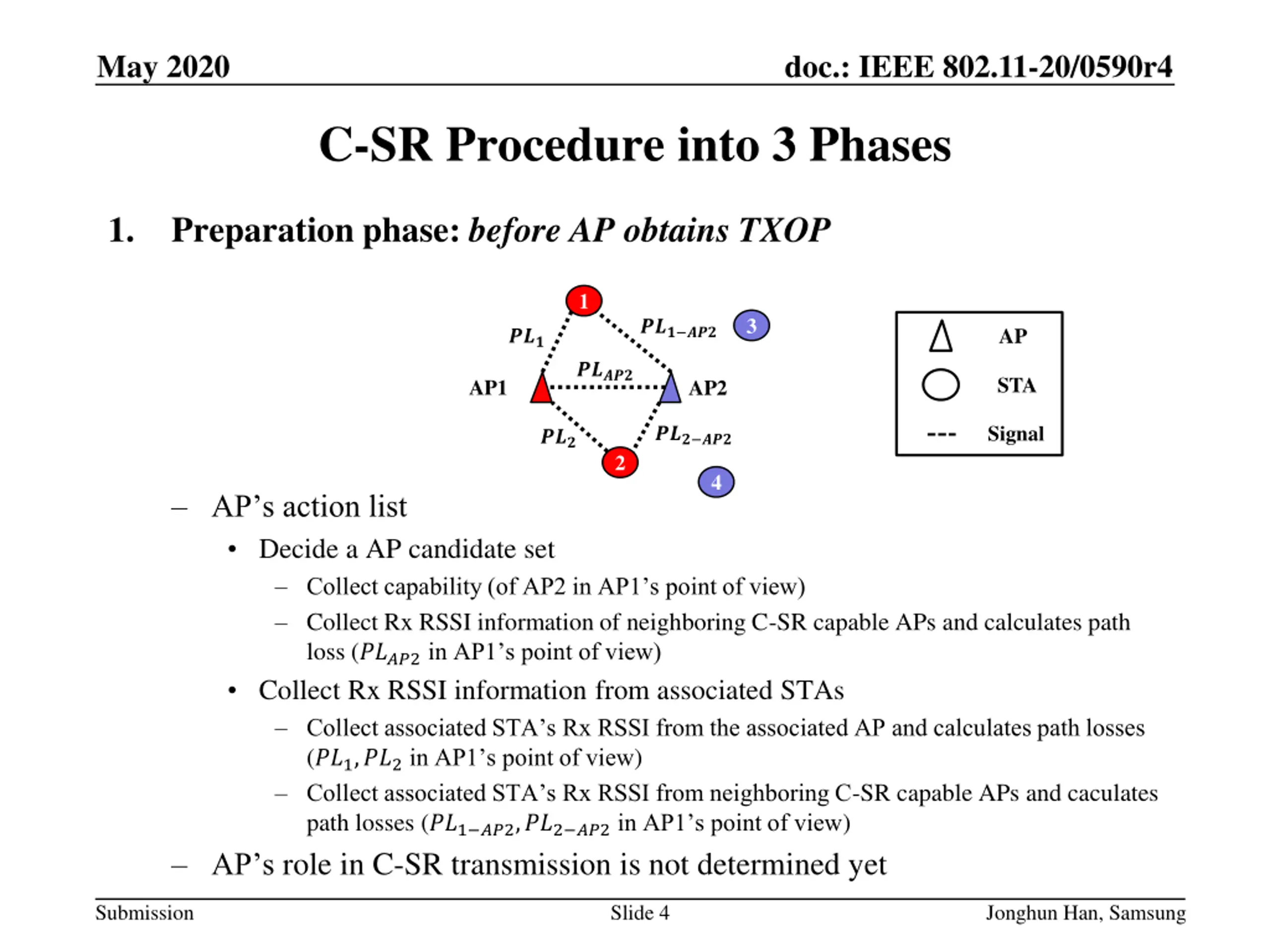 May 2020 doc.: IEEE 802.11-20/0590r4 C-SR Procedure into 3 Phases Preparation phase: before AP obtains TXOP 1. 1 3 ??? ??? AP ??? ????? STA AP1 AP2 Signal ??? ??? ??? 2 4 AP s action list Decide a AP candidate set Collect capability (of AP2 in AP1 s point of view) Collect Rx RSSI information of neighboring C-SR capable APs and calculates path loss (????2in AP1 s point of view) Collect Rx RSSI information from associated STAs Collect associated STA s Rx RSSI from the associated AP and calculates path losses (??1,??2in AP1 s point of view) Collect associated STA s Rx RSSI from neighboring C-SR capable APs and caculates path losses (??1 ??2,??2 ??2in AP1 s point of view) AP s role in C-SR transmission is not determined yet Submission Slide 4 Jonghun Han, Samsung