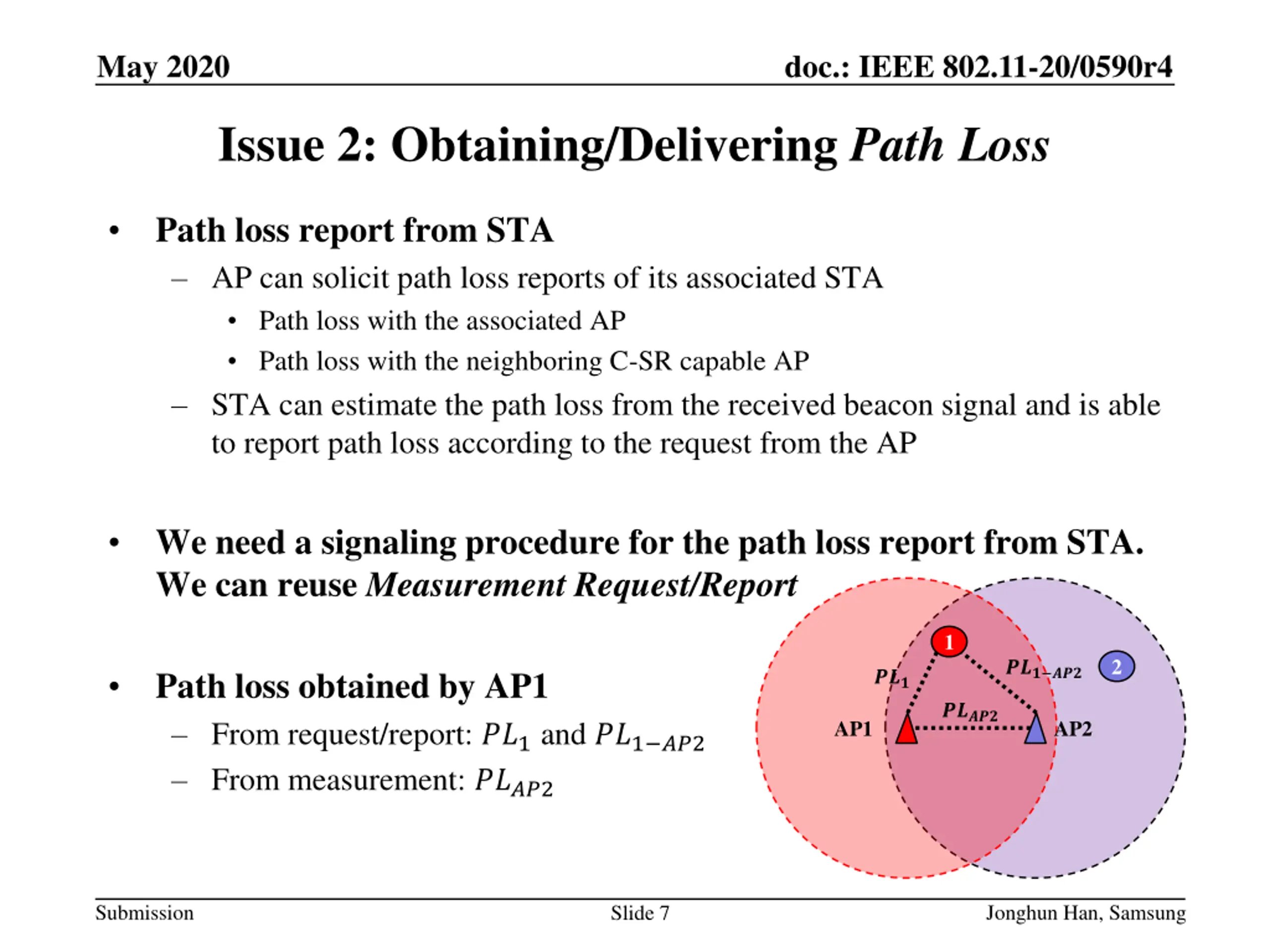 May 2020 doc.: IEEE 802.11-20/0590r4 Issue 2: Obtaining/Delivering Path Loss Path loss report from STA AP can solicit path loss reports of its associated STA Path loss with the associated AP Path loss with the neighboring C-SR capable AP STA can estimate the path loss from the received beacon signal and is able to report path loss according to the request from the AP We need a signaling procedure for the path loss report from STA. We can reuse Measurement Request/Report 1 2 ??? ??? Path loss obtained by AP1 From request/report: ??1 and ??1 ??2 From measurement: ????2 ??? ????? AP1 AP2 Submission Jonghun Han, Samsung Slide 7