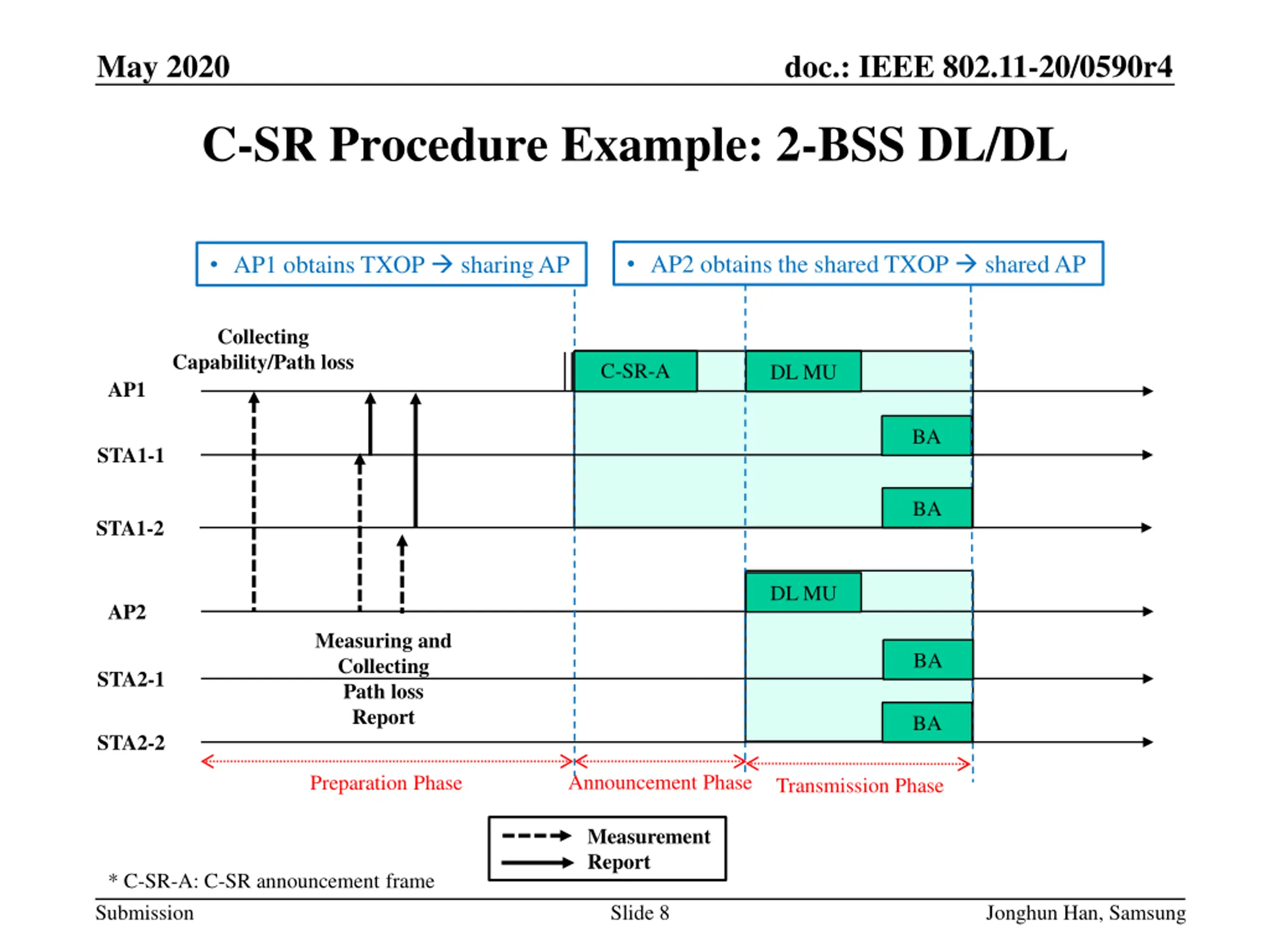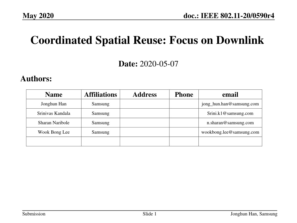 May 2020 doc.: IEEE 802.11-20/0590r4 Coordinated Spatial Reuse: Focus on Downlink Date: 2020-05-07 Authors: Name Affiliations Address Phone email Jonghun Han Samsung jong_hun.han@samsung.com Srinivas Kandala Samsung Srini.k1@samsung.com Sharan Naribole Samsung n.sharan@samsung.com Wook Bong Lee Samsung wookbong.lee@samsung.com Submission Slide 1 Jonghun Han, Samsung