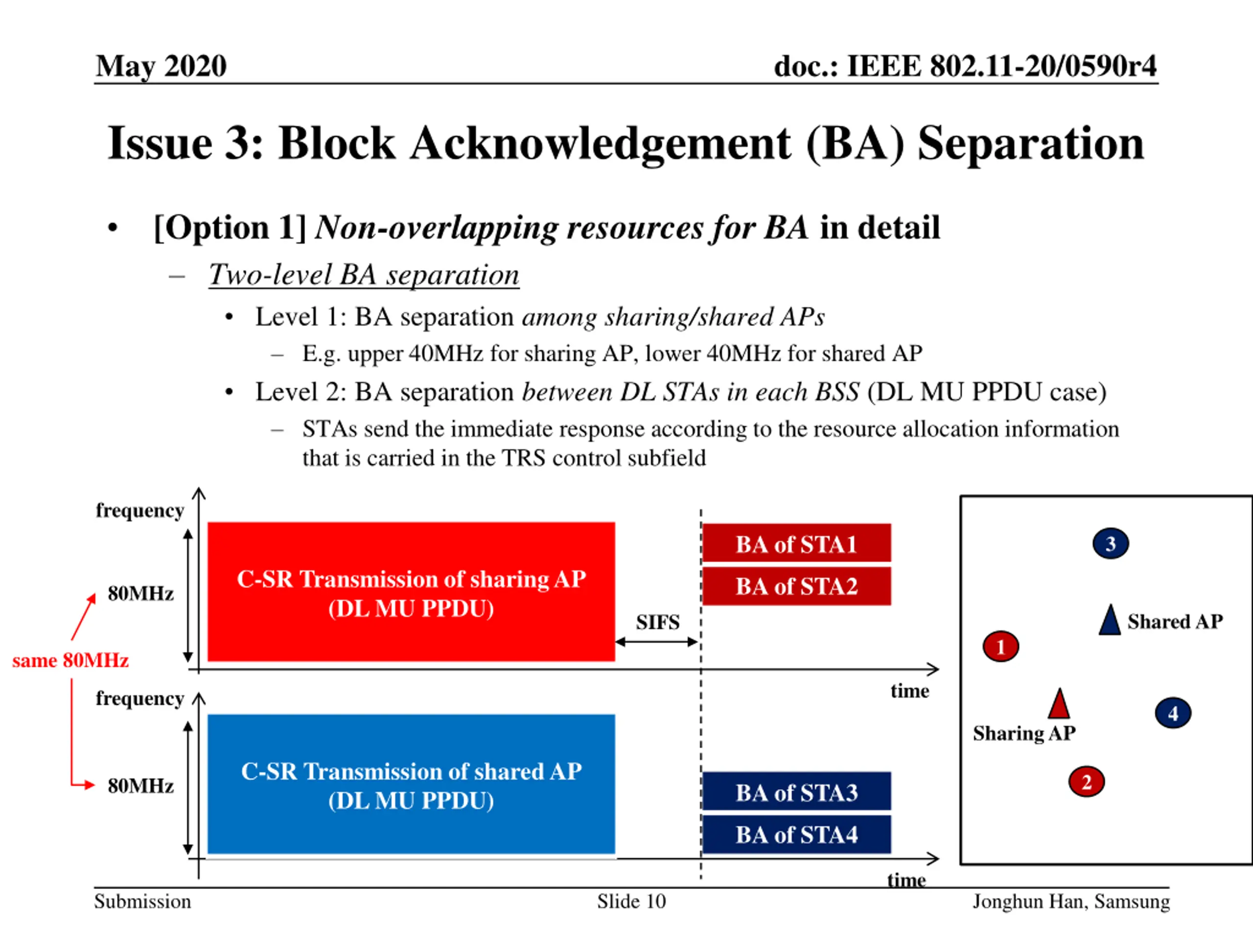 May 2020 doc.: IEEE 802.11-20/0590r4 Issue 3: Block Acknowledgement (BA) Separation [Option 1] Non-overlapping resources for BA in detail Two-level BA separation Level 1: BA separation among sharing/shared APs E.g. upper 40MHz for sharing AP, lower 40MHz for shared AP Level 2: BA separation between DL STAs in each BSS (DL MU PPDU case) STAs send the immediate response according to the resource allocation information that is carried in the TRS control subfield frequency BA of STA1 3 C-SR Transmission of sharing AP (DL MU PPDU) BA of STA2 80MHz Shared AP SIFS 1 same 80MHz time frequency 4 Sharing AP C-SR Transmission of shared AP (DL MU PPDU) 2 80MHz BA of STA3 BA of STA4 time Submission Slide 10 Jonghun Han, Samsung