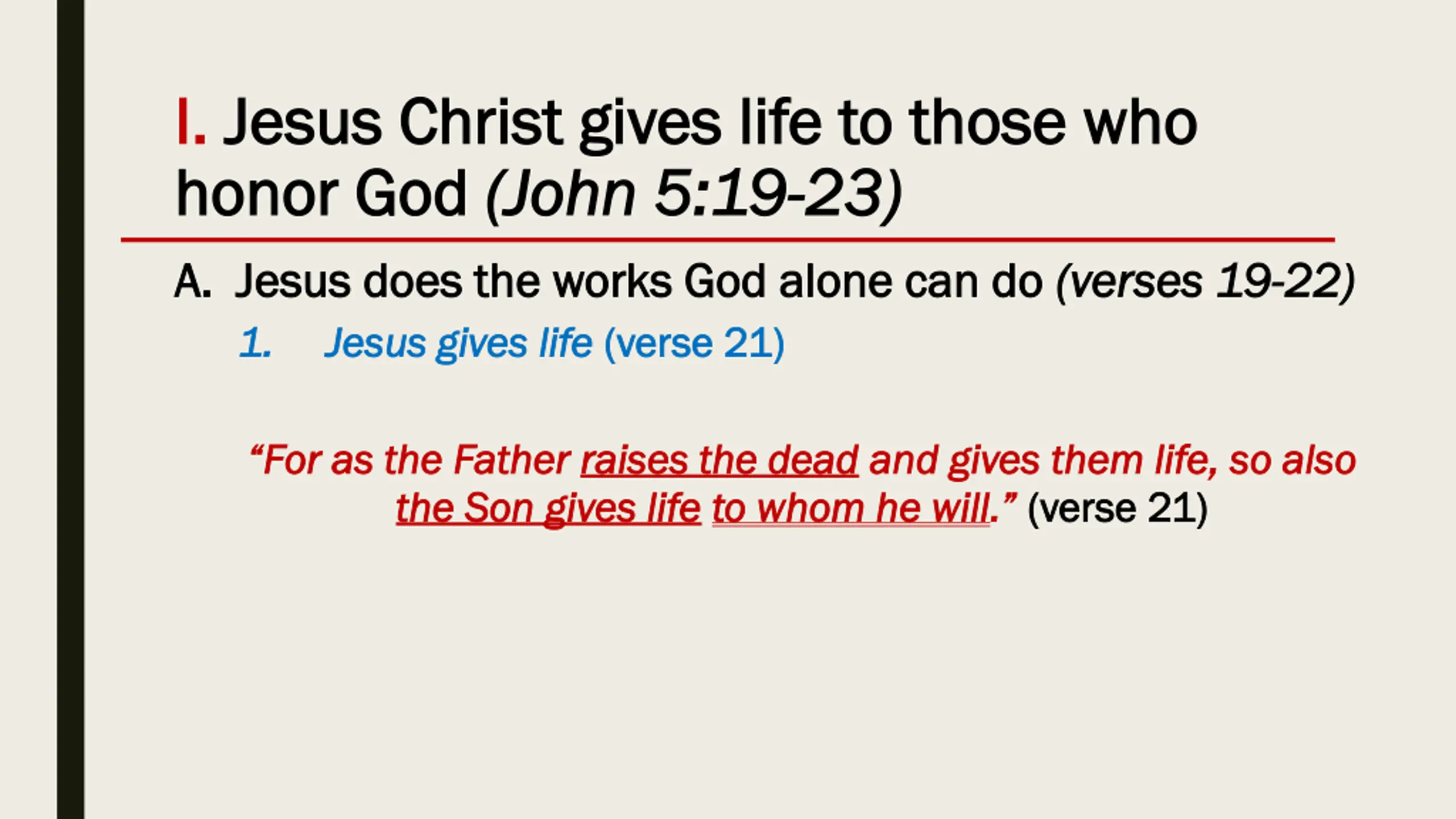 I. I. Jesus Christ gives life to those who Jesus Christ gives life to those who honor God honor God (John 5:19 (John 5:19- -23) A. A. Jesus does the works God alone can do Jesus does the works God alone can do (verses 19 1. 1. Jesus gives life Jesus gives life (verse 21) (verse 21) 23) (verses 19- -22) 22) For as the Father For as the Father raises the dead the Son gives life the Son gives life to whom he will raises the dead and gives them life, so also and gives them life, so also to whom he will. . (verse 21) (verse 21)