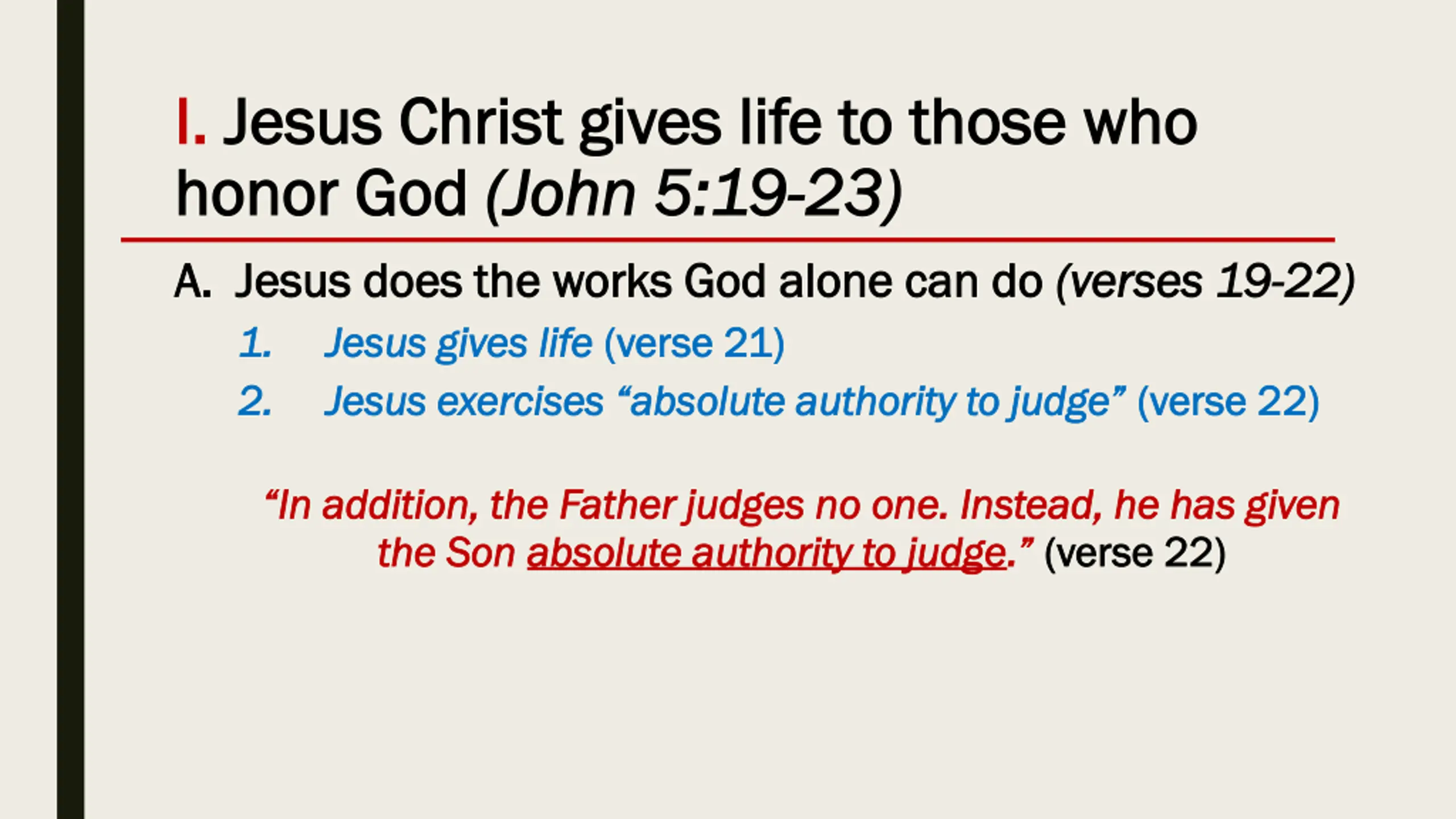 I. I. Jesus Christ gives life to those who Jesus Christ gives life to those who honor God honor God (John 5:19 (John 5:19- -23) A. A. Jesus does the works God alone can do Jesus does the works God alone can do (verses 19 1. 1. Jesus gives life Jesus gives life (verse 21) (verse 21) 2. 2. Jesus exercises absolute authority to judge Jesus exercises absolute authority to judge (verse 22) 23) (verses 19- -22) 22) (verse 22) In addition, the Father judges no one. Instead, he has given In addition, the Father judges no one. Instead, he has given the Son the Son absolute authority to judge absolute authority to judge. . (verse 22) (verse 22)