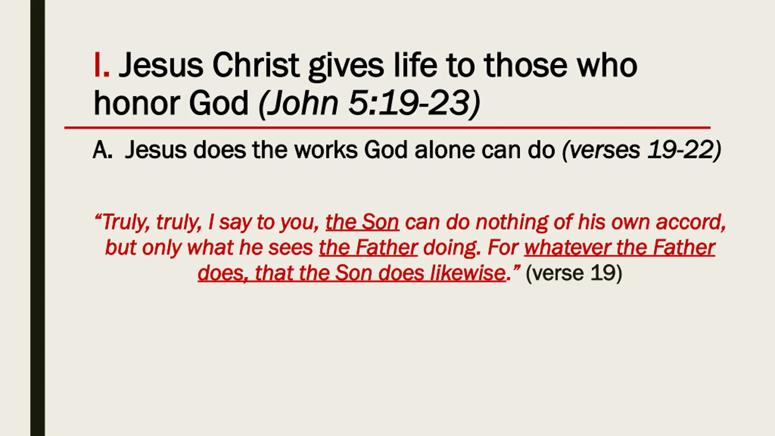 I. I. Jesus Christ gives life to those who Jesus Christ gives life to those who honor God honor God (John 5:19 (John 5:19- -23) A. A. Jesus does the works God alone can do Jesus does the works God alone can do (verses 19 23) (verses 19- -22) 22) Truly, truly, I say to you, Truly, truly, I say to you, the Son but only what he sees but only what he sees the Father does, that the Son does likewise does, that the Son does likewise. . (verse 19) the Son can do nothing of his own accord, can do nothing of his own accord, the Father doing. For doing. For whatever the Father whatever the Father (verse 19)