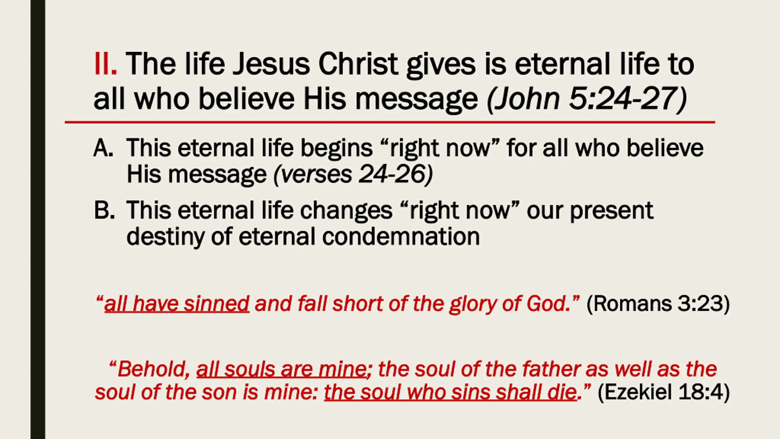 II. II. The life Jesus Christ gives is eternal life to The life Jesus Christ gives is eternal life to all who believe His message all who believe His message (John 5:24 (John 5:24- -27) 27) A. A. This eternal life begins right now for all who believe This eternal life begins right now for all who believe His message His message (verses 24 (verses 24- -26) 26) B. B. This eternal life changes right now our present This eternal life changes right now our present destiny of eternal condemnation destiny of eternal condemnation all have sinned all have sinned and fall short of the glory of God. and fall short of the glory of God. (Romans 3:23) (Romans 3:23) Behold, Behold, all souls are mine all souls are mine; the soul of the father as well as the ; the soul of the father as well as the soul of the son is mine: soul of the son is mine: the soul who sins shall die the soul who sins shall die. . (Ezekiel 18:4) (Ezekiel 18:4)