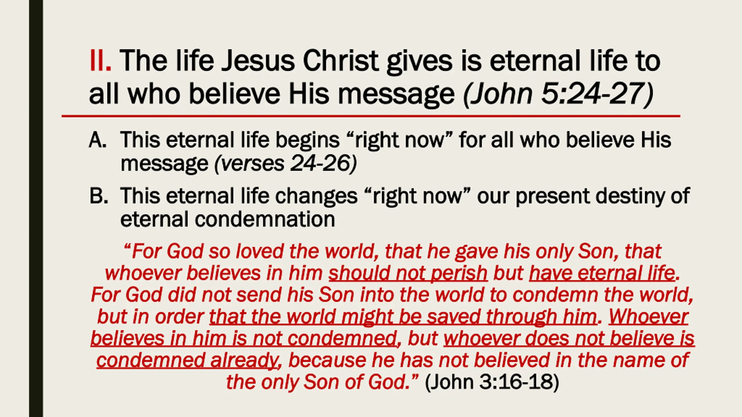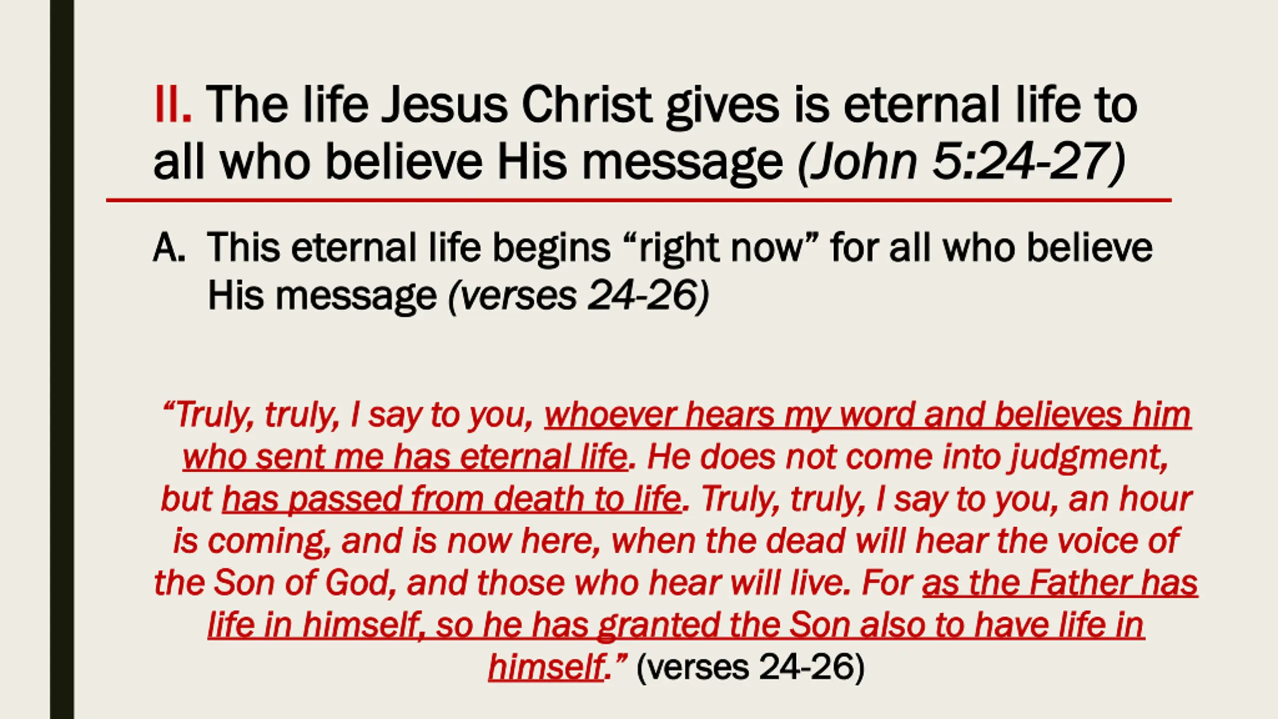 II. II. The life Jesus Christ gives is eternal life to The life Jesus Christ gives is eternal life to all who believe His message all who believe His message (John 5:24 (John 5:24- -27) 27) A. A. This eternal life begins right now for all who believe This eternal life begins right now for all who believe His message His message (verses 24 (verses 24- -26) 26) Truly, truly, I say to you, Truly, truly, I say to you, whoever hears my word and believes him whoever hears my word and believes him who sent me has eternal life who sent me has eternal life. He does not come into judgment, . He does not come into judgment, but but has passed from death to life has passed from death to life. Truly, truly, I say to you, an hour is coming, and is now here, when the dead will hear the voice of is coming, and is now here, when the dead will hear the voice of the Son of God, and those who hear will live. For the Son of God, and those who hear will live. For as the Father has life in himself, so he has granted the Son also to have life in life in himself, so he has granted the Son also to have life in himself himself. . (verses 24 (verses 24- -26) . Truly, truly, I say to you, an hour as the Father has 26)