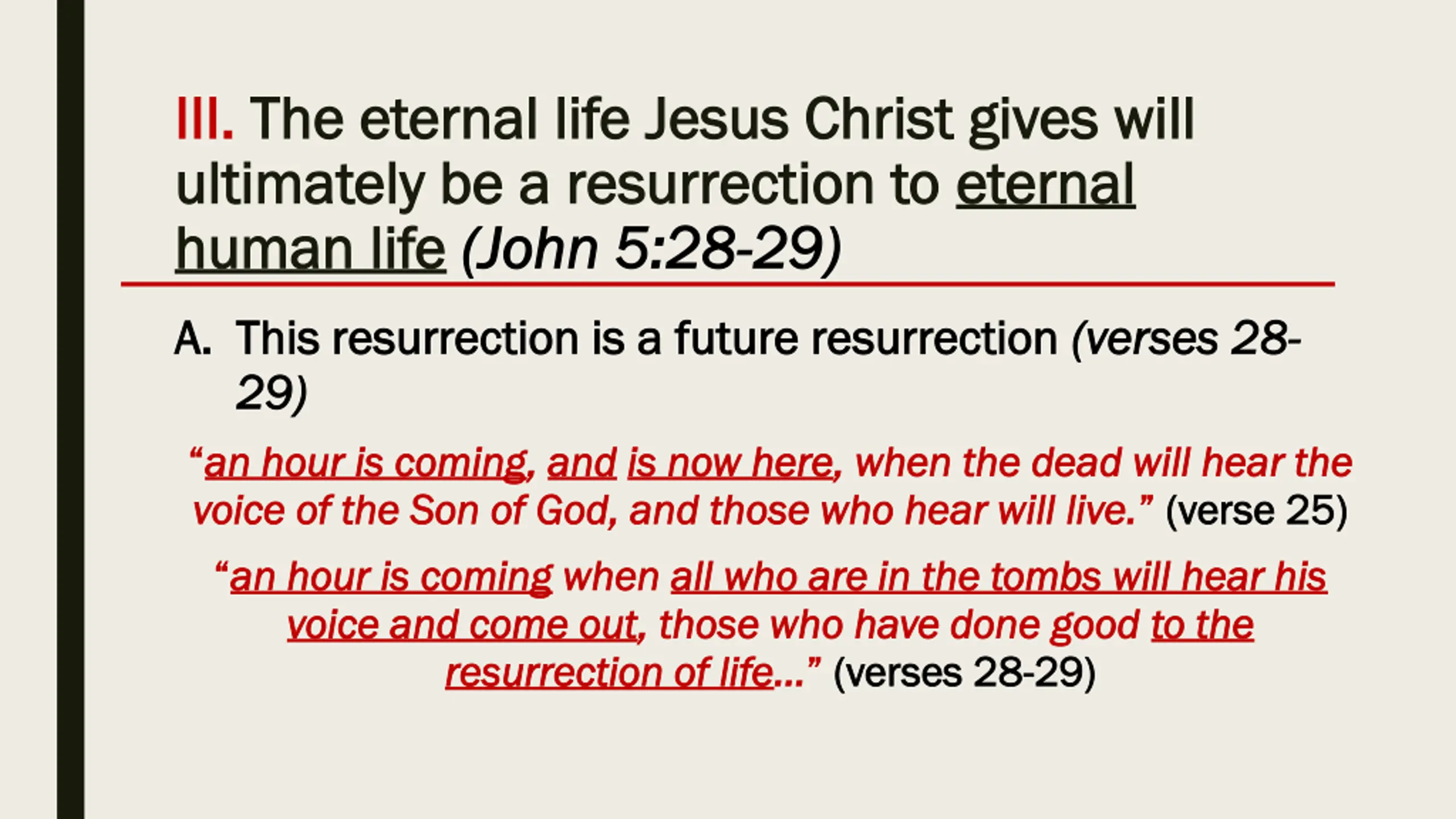 III. III. The eternal life Jesus Christ gives will The eternal life Jesus Christ gives will ultimately be a resurrection to ultimately be a resurrection to eternal human life human life (John 5:28 (John 5:28- -29) eternal 29) A. A. This resurrection is a future resurrection This resurrection is a future resurrection (verses 28 B. B. This future resurrection will confirm the truth Jesus This future resurrection will confirm the truth Jesus teaches about both the life and judgment He brings teaches about both the life and judgment He brings (verse 29) 29) those who have done good to the resurrection of life, and those those who have done good to the resurrection of life, and those who have done evil to the resurrection of judgment. who have done evil to the resurrection of judgment. (verse 29) Truly, truly, I say to you, whoever hears my word and believes him Truly, truly, I say to you, whoever hears my word and believes him who sent me has eternal life. He does not come into judgment, who sent me has eternal life. He does not come into judgment, but has passed from death to life but has passed from death to life. . (verse 24) (verses 28- -29) 29) (verse (verse 29) (verse 24)