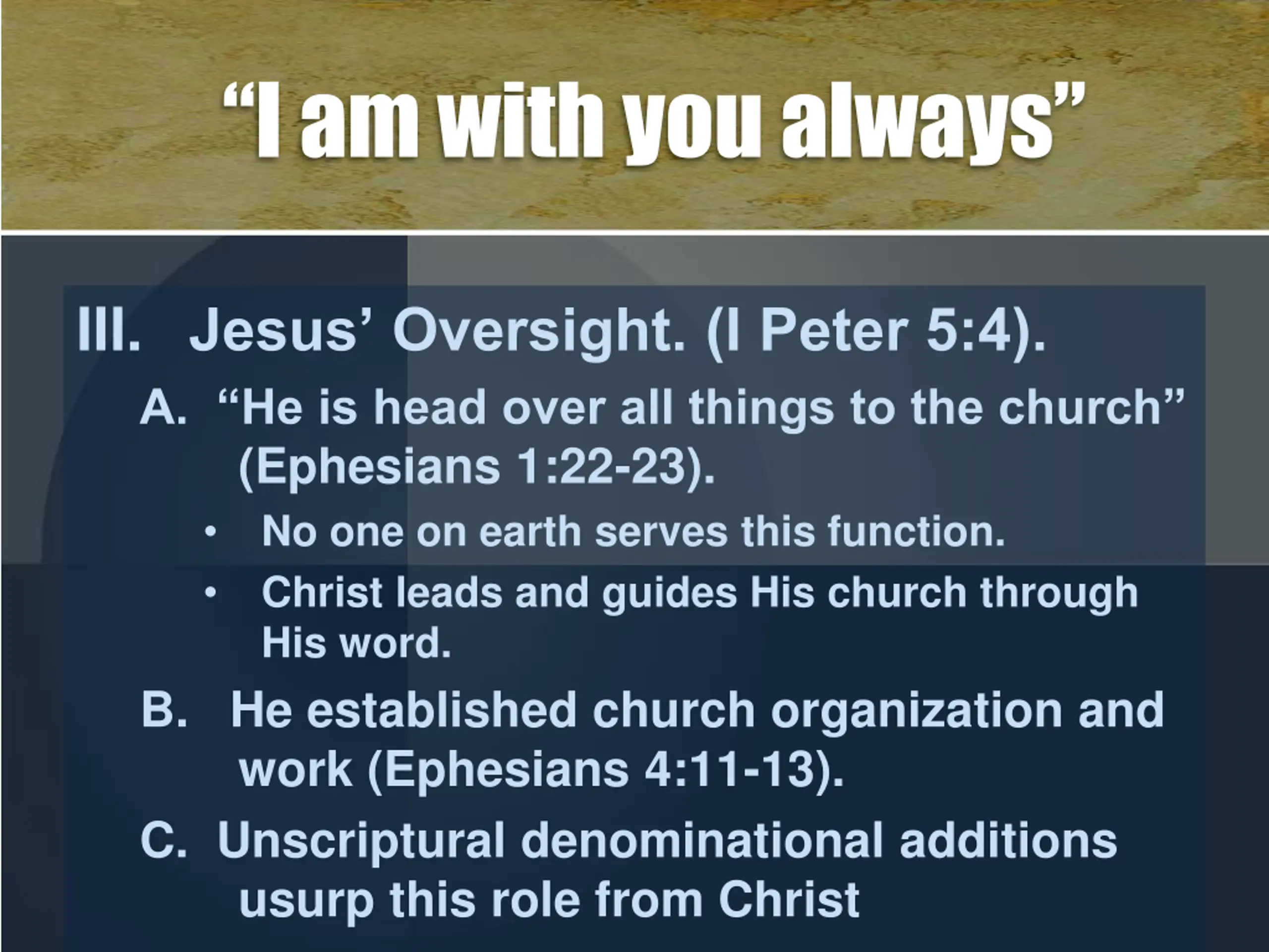 I am with you always III. Jesus Oversight. (I Peter 5:4). A. He is head over all things to the church (Ephesians 1:22-23). No one on earth serves this function. Christ leads and guides His church through His word. B. He established church organization and work (Ephesians 4:11-13). C. Unscriptural denominational additions usurp this role from Christ