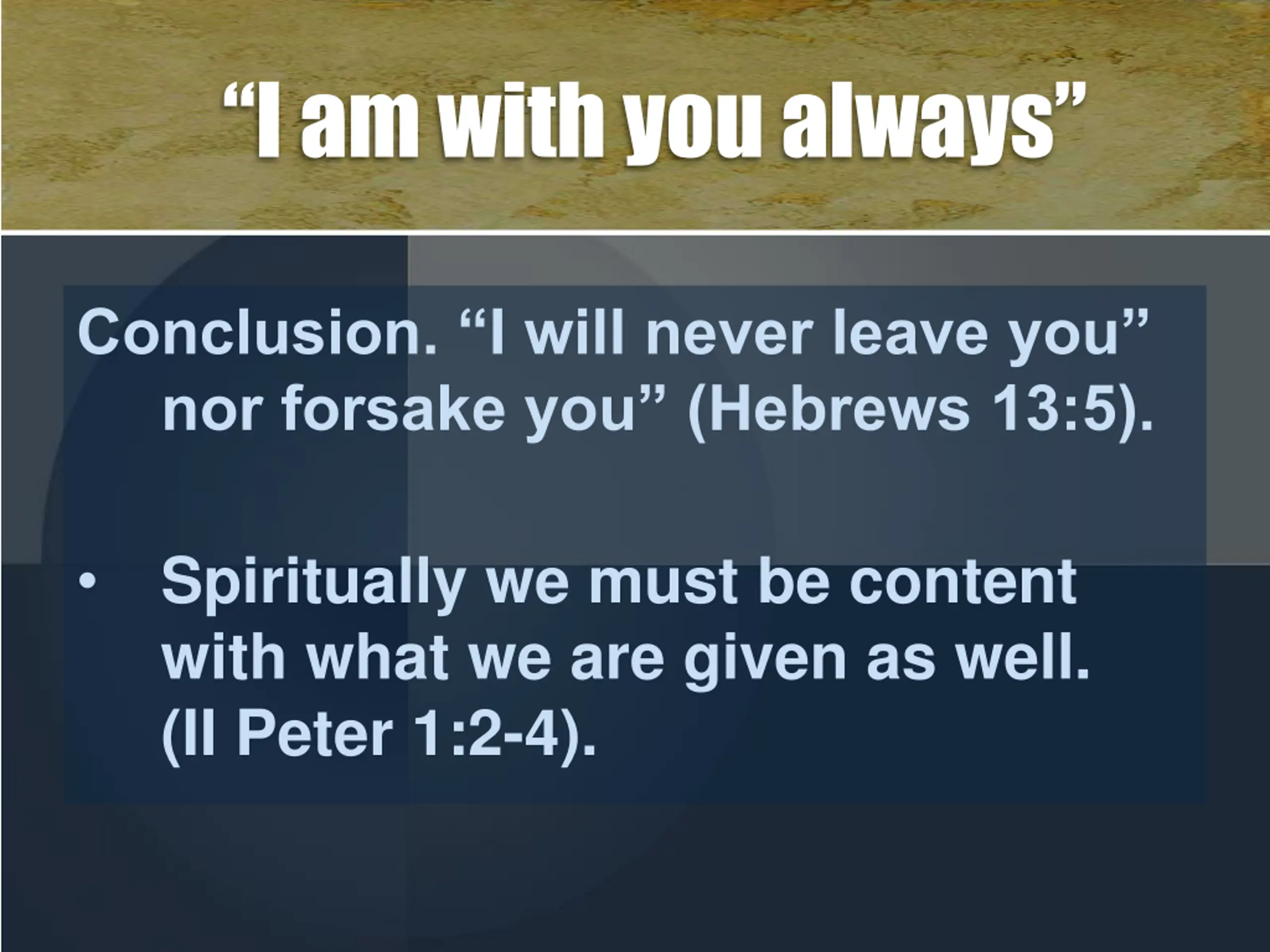 I am with you always Conclusion. I will never leave you nor forsake you (Hebrews 13:5). Spiritually we must be content with what we are given as well. (II Peter 1:2-4).