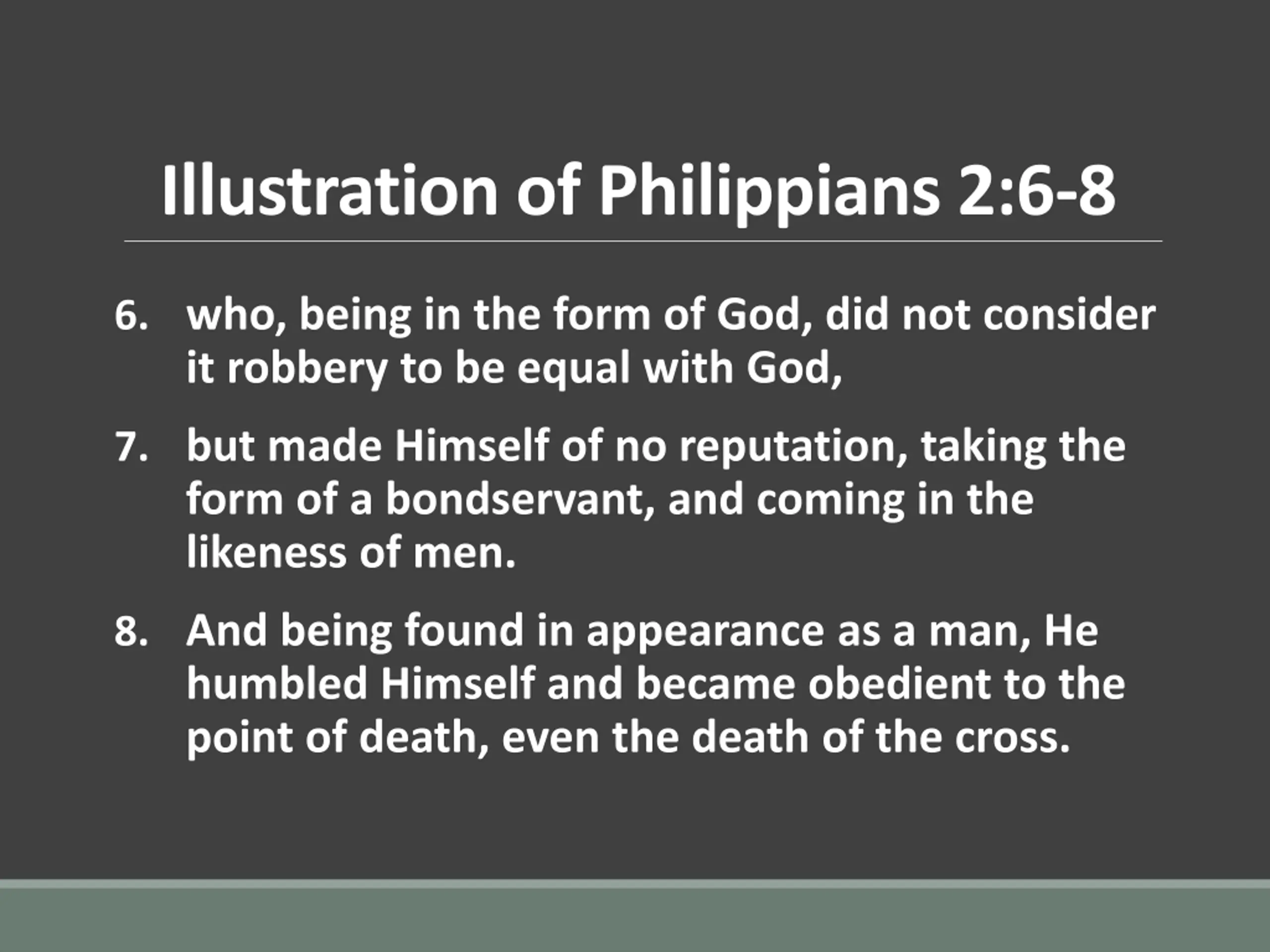 Illustration of Philippians 2:6-8 6. who, being in the form of God, did not consider it robbery to be equal with God, 7. but made Himself of no reputation, taking the form of a bondservant, and coming in the likeness of men. 8. And being found in appearance as a man, He humbled Himself and became obedient to the point of death, even the death of the cross.