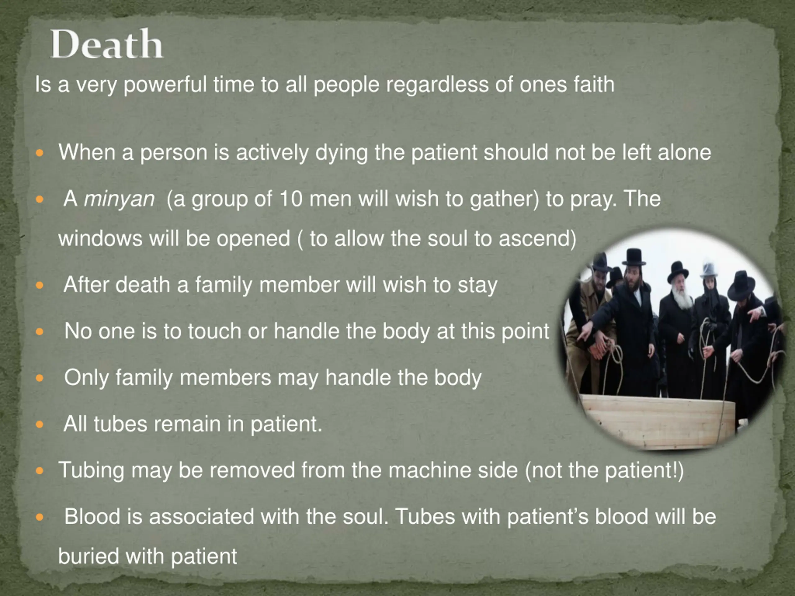 Death Is a very powerful time to all people regardless of ones faith When a person is actively dying the patient should not be left alone A minyan (a group of 10 men will wish to gather) to pray. The windows will be opened ( to allow the soul to ascend) After death a family member will wish to stay No one is to touch or handle the body at this point Only family members may handle the body All tubes remain in patient. Tubing may be removed from the machine side (not the patient!) Blood is associated with the soul. Tubes with patient s blood will be buried with patient