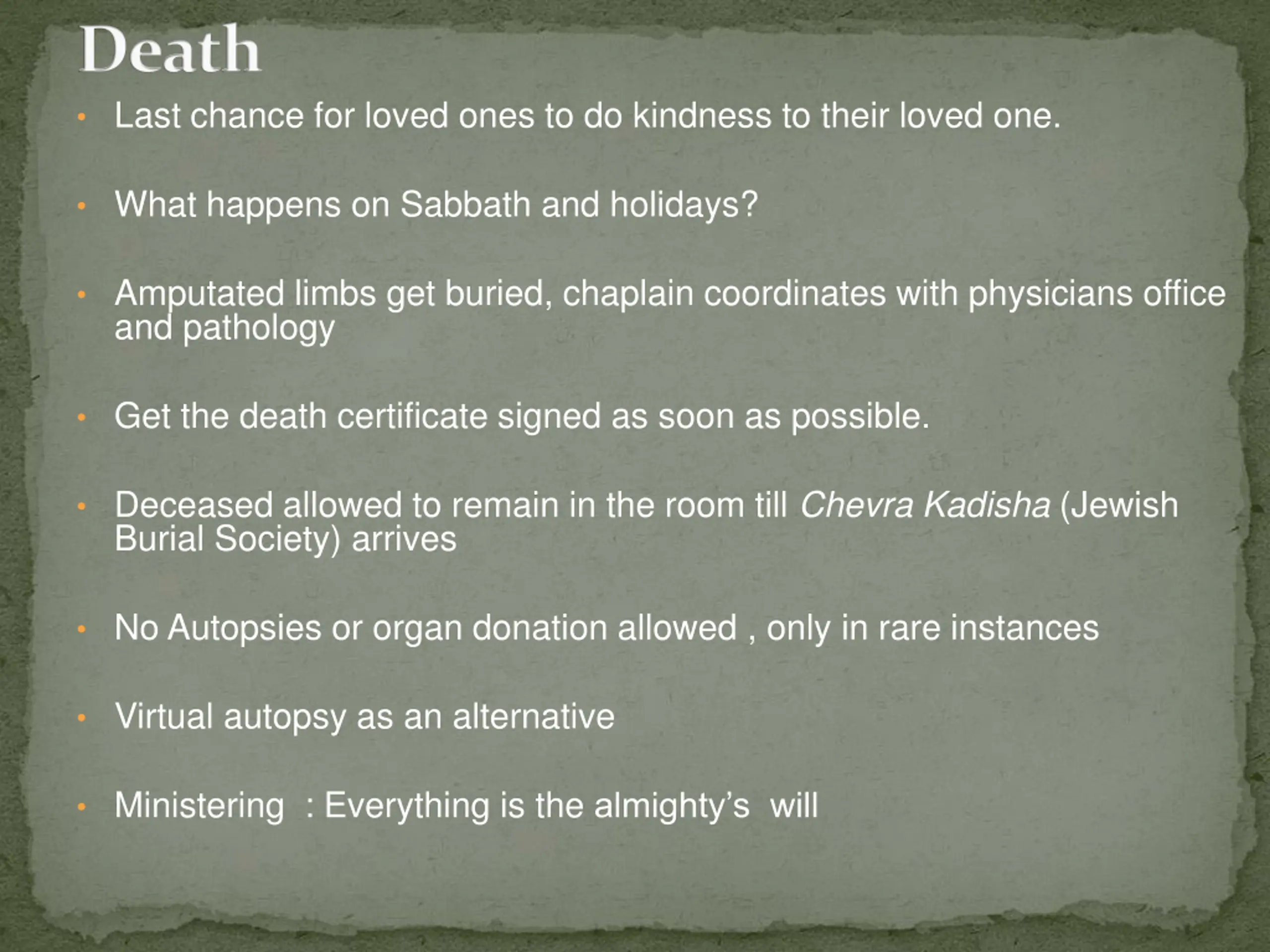 Death Last chance for loved ones to do kindness to their loved one. What happens on Sabbath and holidays? Amputated limbs get buried, chaplain coordinates with physicians office and pathology Get the death certificate signed as soon as possible. Deceased allowed to remain in the room till Chevra Kadisha (Jewish Burial Society) arrives No Autopsies or organ donation allowed , only in rare instances Virtual autopsy as an alternative Ministering : Everything is the almighty s will